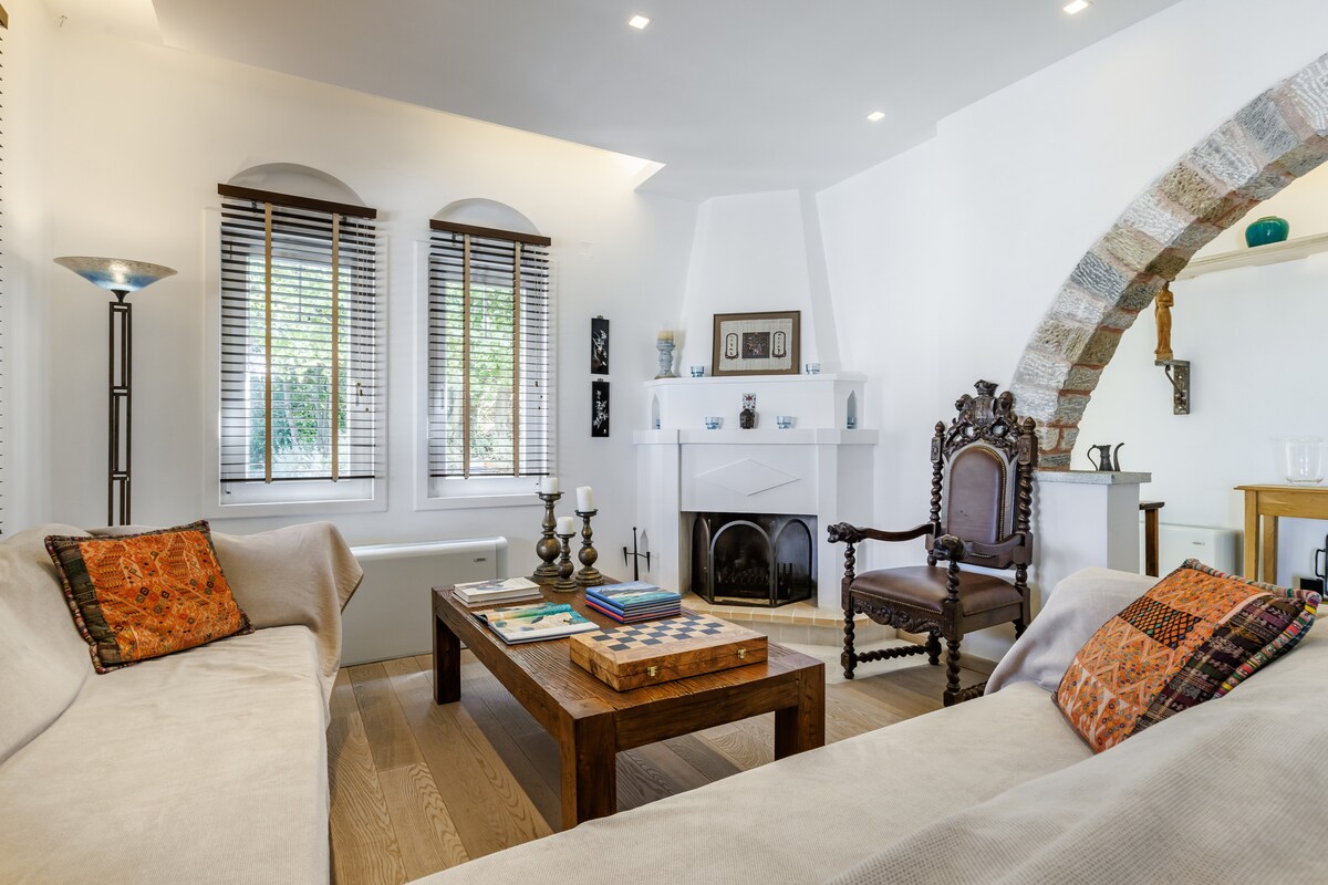 Villa located on a forested mountain side overlooking the Aegean Sea, with swimming pool and private gardens. Hosts up to 4 guests for rest but also outfitted for work. Pool/Beach towels are not provided. Νέα στην αγορά ενοικίασης το 2022. Εως 4 άτομα .Η κεντρική βίλα οικογενειακού εξοχικού συγκροτήματος, σε δασώδη πλαγιά με θέα στο Αιγαίο Πέλαγοςμε πισίνα και κήπους. Προορίζεται για χαλάρωση αλλά και εξοπλισμένο για εργασία. Δεν παρέχονται πετσέτες για τη θάλασσα/πισίνα.