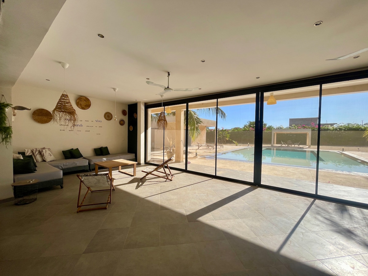 Casa con piscina y jacuzzi a 60 m de la playa y a 2 km de la laguna .Ideal para hacer salidas en bicicleta, paseos por la playa o fiestas junto a la laguna para los más fiesteros. Casa ideal con niños , tranquila para descansar lejos del bullicio y al mismo tiempo a 10 minutos de la Somone y a 50 minutos de Dakar. Los amantes de la naturaleza podrán fundirse en la exuberante vegetación del manglar y los más románticos contemplar hermosas puestas de sol en la playa