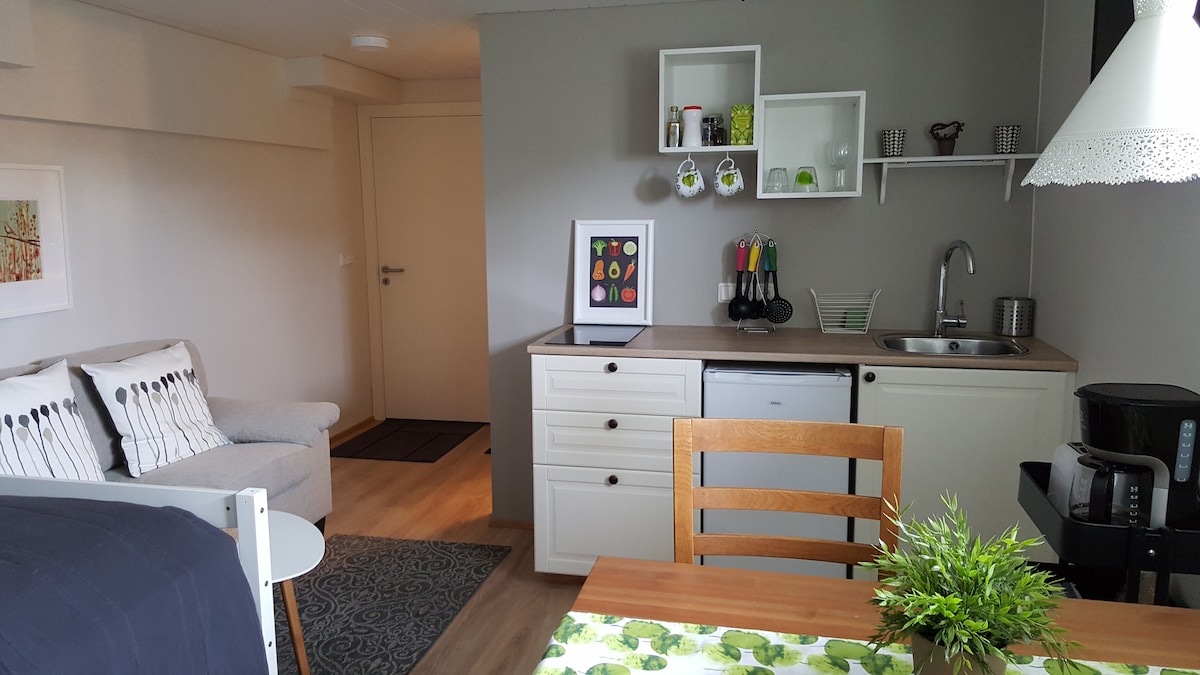 Pequeño y acogedor apartamento estudio en el sótano de 20 m² renovado a principios de año de 2017, la base perfecta para explorar la zona del lago Myvatn, ¡con los cráteres de Skútustaðir a menos de 5 minutos a pie de tu puerta! Cocina pequeña, pequeña sala de estar, baño completo. Acceso a una lavadora y una secadora y una bañera de hidromasaje. Entrada independiente de otros huéspedes. Si te gusta mirar las estrellas y tal vez echar un vistazo a las auroras boreales mientras te relajas en un jacuzzi durante el invierno, ¡este es el lugar ideal para ti!
