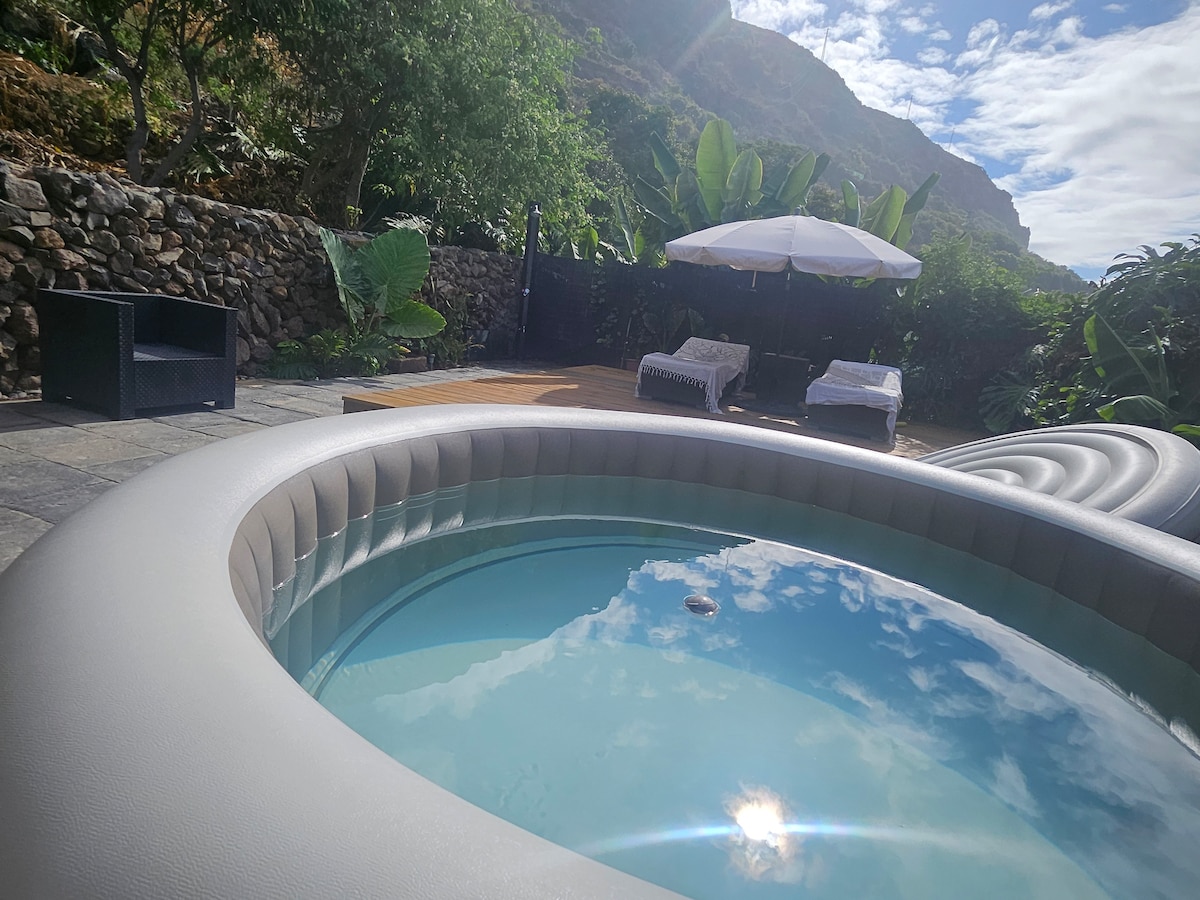 Casa con maravillosas vistas al mar, amplia terraza con mobiliario de exterior y con jacuzzi sobre el jardín de plantas exóticas y plantación de aguacates . Perfecta para disfrutar de la tranquilidad, y fantástica, para volver después de un día de excursión y relajarse en su jacuzzi con estupendas vistas. Luminoso dormitorio , acogedor salón y cocina con salida a la terraza y al jardín. Casa Lava es ideal para parejas, no es segura para niños ni bebés,hay zonas sin barandilla