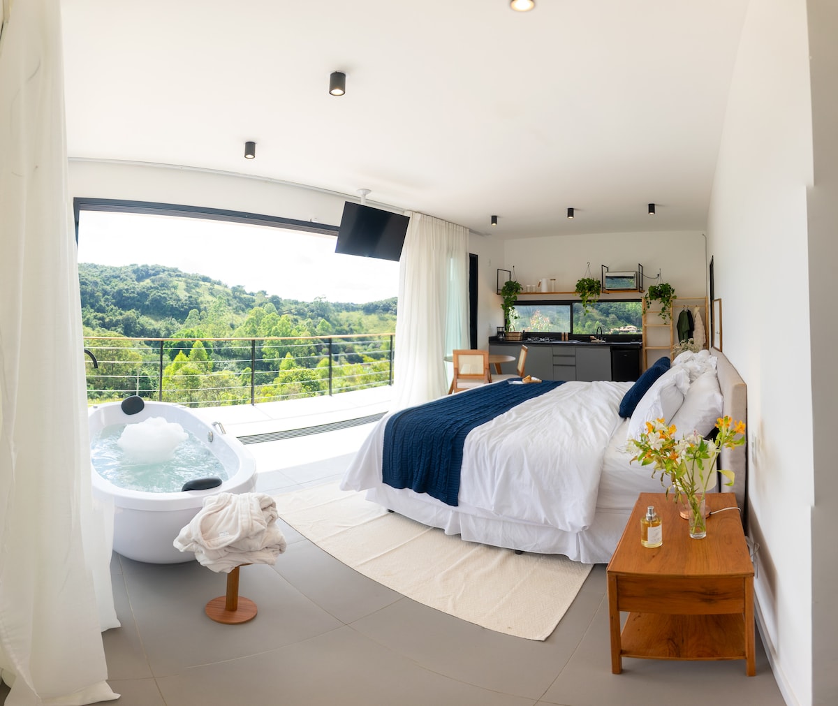 Equipado com uma elegante cama queen-size, ideal para uma boa noite de sono, o ambiente também dispõe de uma TV de 43 polegadas com acesso a todos os streamings e canais nacionais e internacionais. O frigobar garante praticidade, enquanto a roupa de cama e banho de alta qualidade assegura o máximo conforto. Os banheiros possuem acabamento em porcelanato e chuveiros de última geração, com potência de 7500w, para uma experiência de banho revitalizante.