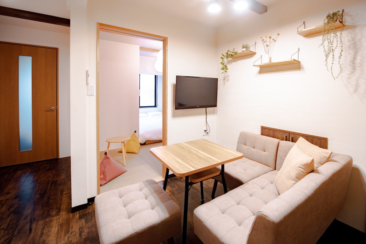Amplio y luminoso Kyomachiya. El tamaño de la habitación es de unos 99 metros cuadrados y el interior tiene un acabado sencillo para mantener la limpieza. ❖ Cada vez que limpies, primero pásale una toallita desinfectante desechable con alcohol. No solo las manijas e interruptores que tocan las manos, sino también los sofás, las mesas y los pisos se limpian con alcohol cada vez para que estén limpios. Además, dado que todo el edificio está reservado, puedes alojarte con total tranquilidad en cualquier momento sin tener contacto con otros huéspedes.
