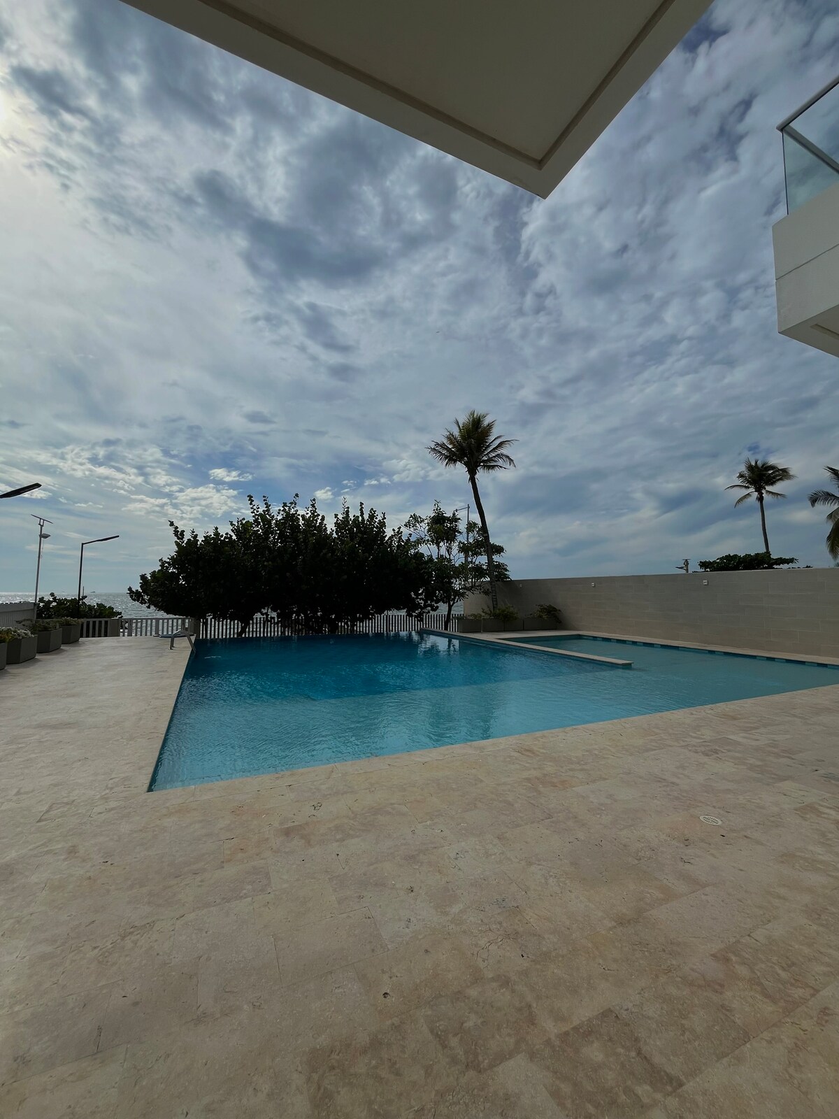 Hermoso apartamento en magnifico condominio frente a la playa. El apartamento consta de una luminosa sala-comedor, balcón con vista al mar, tres dormitorios, cocina, dos baños y patio de labores