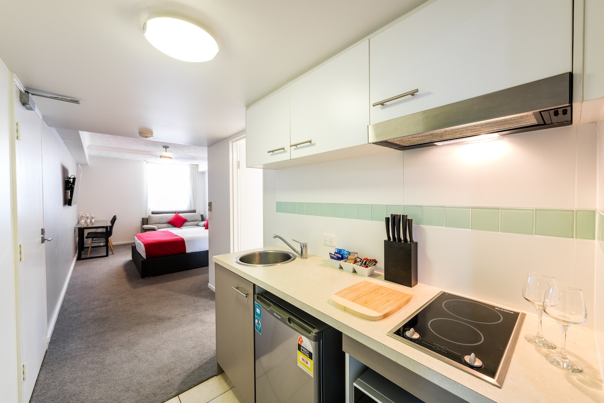 Walk out the lift and you're in the heart of the CBD, with all the cafes, restaurants and shopping just steps away. This modern fully self-contained CBD studio apartment. Situated in a secure complex The apartment is larger than average bedsits with a leather lounge and 55" TV as well as a quality bed. There is free wi-fi available, as well as a pool/gym in the complex. NB. POOL AND SPA CURRENTLY UNAVAILABLE DUE TO EMERGENCY REPAIRS.