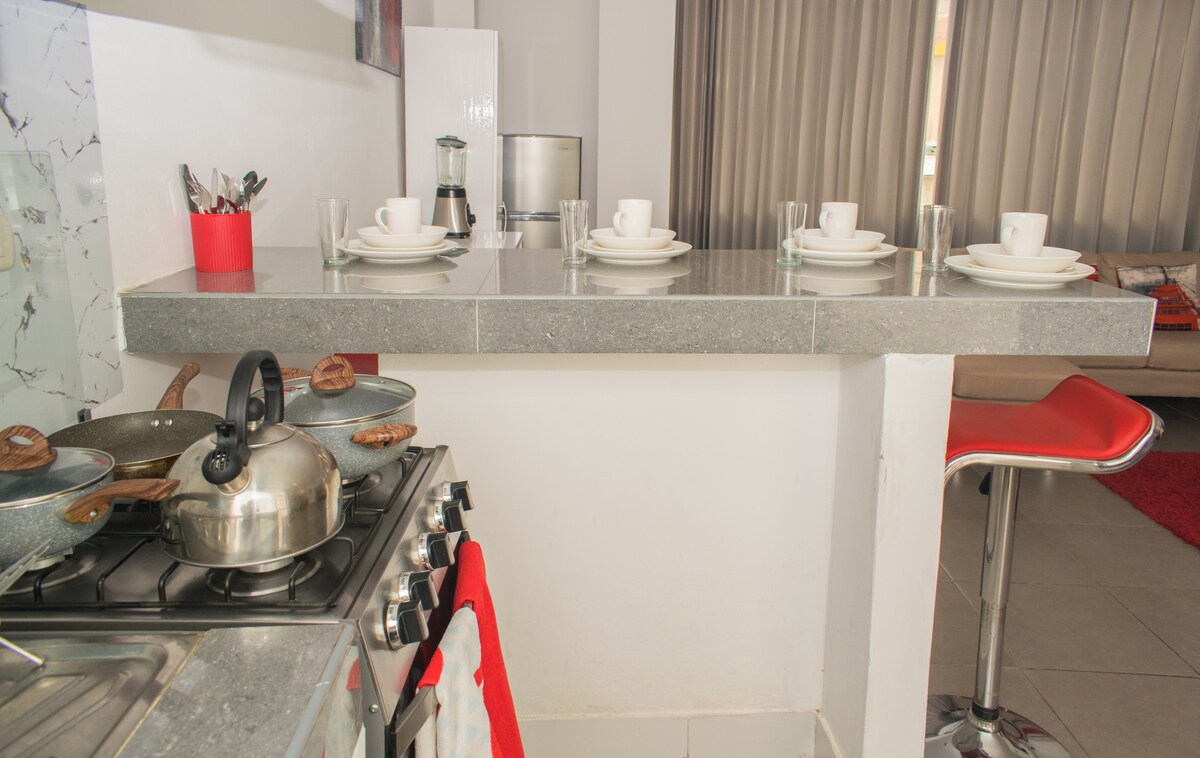Bonito departamento, espacioso ,familiar, ubicado en el centro de la ciudad . 2 cuarto, 1 baño,lobby ,cocina totalmente equipadas para su uso,lavandería y patio,con agua caliente tv cable ,wifi.