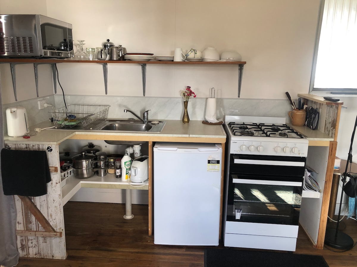 Take it easy at this unique and tranquil getaway. The cabin is the converted pickers quarters when the property was a stone fruit orchard in the past. Have recently planted feijoa orchard. A small and cozy space with spacious verandahs to the north and west. Situated on a quiet and private 100 acres. Abundant bird and wildlife. The cabin is self-catering. Breakfast is not provided altho’ tea and coffee making facilities and basic condiments are provided. The cabin is not suitable for children.