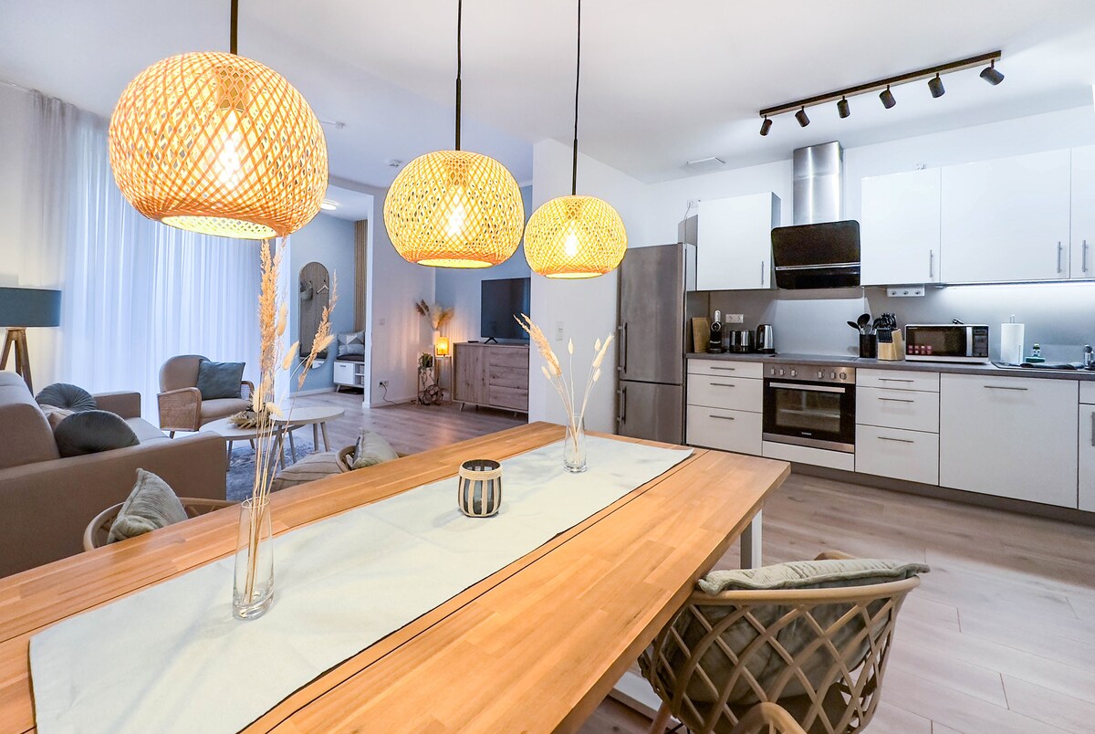 El departamento está en la planta baja y tiene capacidad para 2 personas. El baño está equipado con una ducha grande y baja, cabina de infrarrojos y calefacción por suelo radiante. La cocina está totalmente equipada con cafetera, tostadora y hervidor de agua. La lavadora-secadora también está integrada en este. Los techos altos y los grandes ventanales dan una gran sensación de espacio, que está subrayada por las modernas lámparas LED. Atenuar las habitaciones o ajustar la temperatura de la luz como se desee.