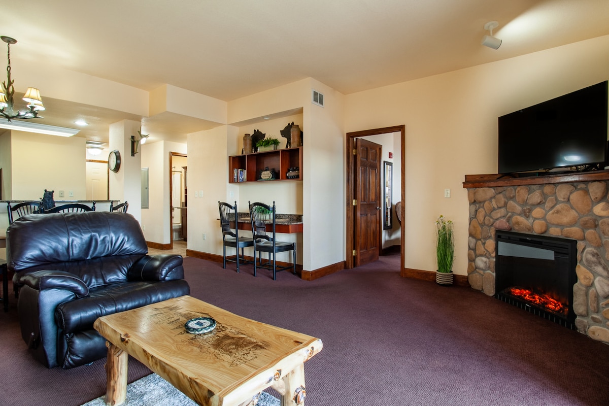 ¡Ven a rodar por los bosques y echa un vistazo a Tennessee Byway! Ubicado en Chalet Village y a menos de 1 milla del Ober Ski Resort; este es el refugio de invierno perfecto. ¡También a solo 3 millas del centro de la ciudad y del parque nacional! Con capacidad para 6 personas, esta cabaña de 2 dormitorios viene con 2 camas tamaño king flotantes personalizadas y una litera doble incorporada. ¡Puedes ver impresionantes vistas de las montañas desde cada habitación! La cabaña viene con wifi rápido, parrilla, jacuzzi, 3 piscinas, gimnasio compartido y sala de juegos y más. ¡Échanos un vistazo!