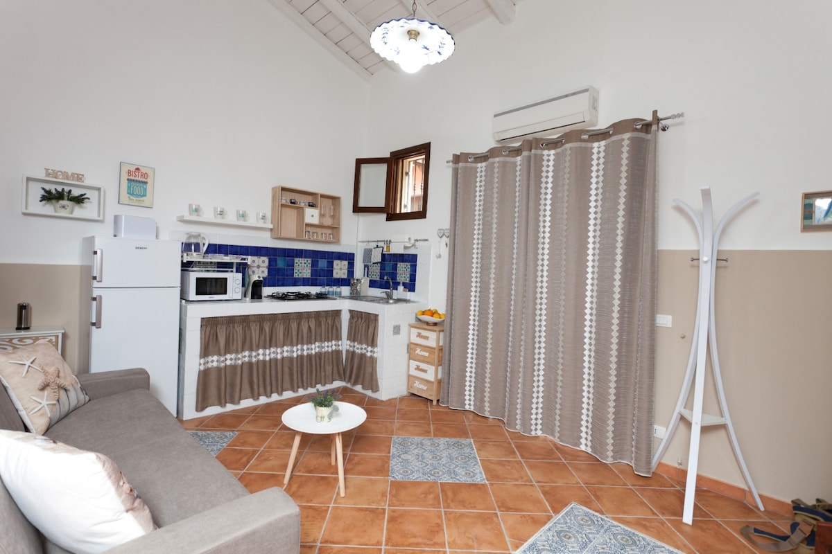 El estudio cuenta con cocina americana, cama doble e individual, baño con ducha y terraza al aire libre donde puedes consumir comidas. Se encuentra a unos 500 metros del puerto y a unos 300 metros de la playa más cercana. Se encuentra en una típica cantera de toba de la isla inmersa en un exuberante jardín subterráneo, por lo que garantiza tranquilidad y relajación.