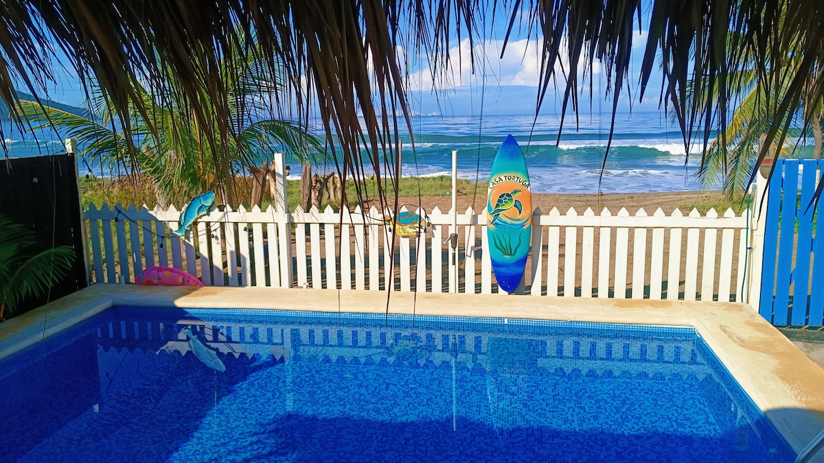 Casa Tortuga is a brand new luxury beachfront Villa on the shores of Playa la Saladita, steps away from world-class surfing. This 3 bedroom house sleeps 8 and can be rented separately or with the casita for a total of 10 guests. The house was designed so that every room has a view of the ocean and local surf break. Luxury linens, comfortable king-size beds, fully stocked kitchen, airconditioning, and hot water make this home unique to the area.