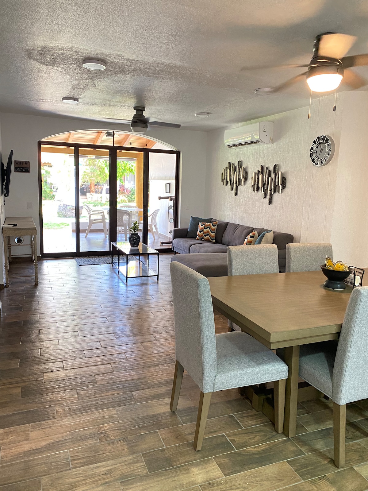 Disfruta de una estancia relajada en nuestra casa cerca de la playa con alberca entre árboles y palmeras, ideal para pasar días tranquilos en familia. Cuenta con 4 recámaras con aire acondicionado; 2 con baño privado y 2 que comparten baño exterior. Medio baño adicional. Sala y comedor amplios, cocina equipada (sin aire en áreas comunes). Disfruta la vista al jardín y alberca, con estacionamiento para 3 autos, en un ambiente cálido y cómodo.