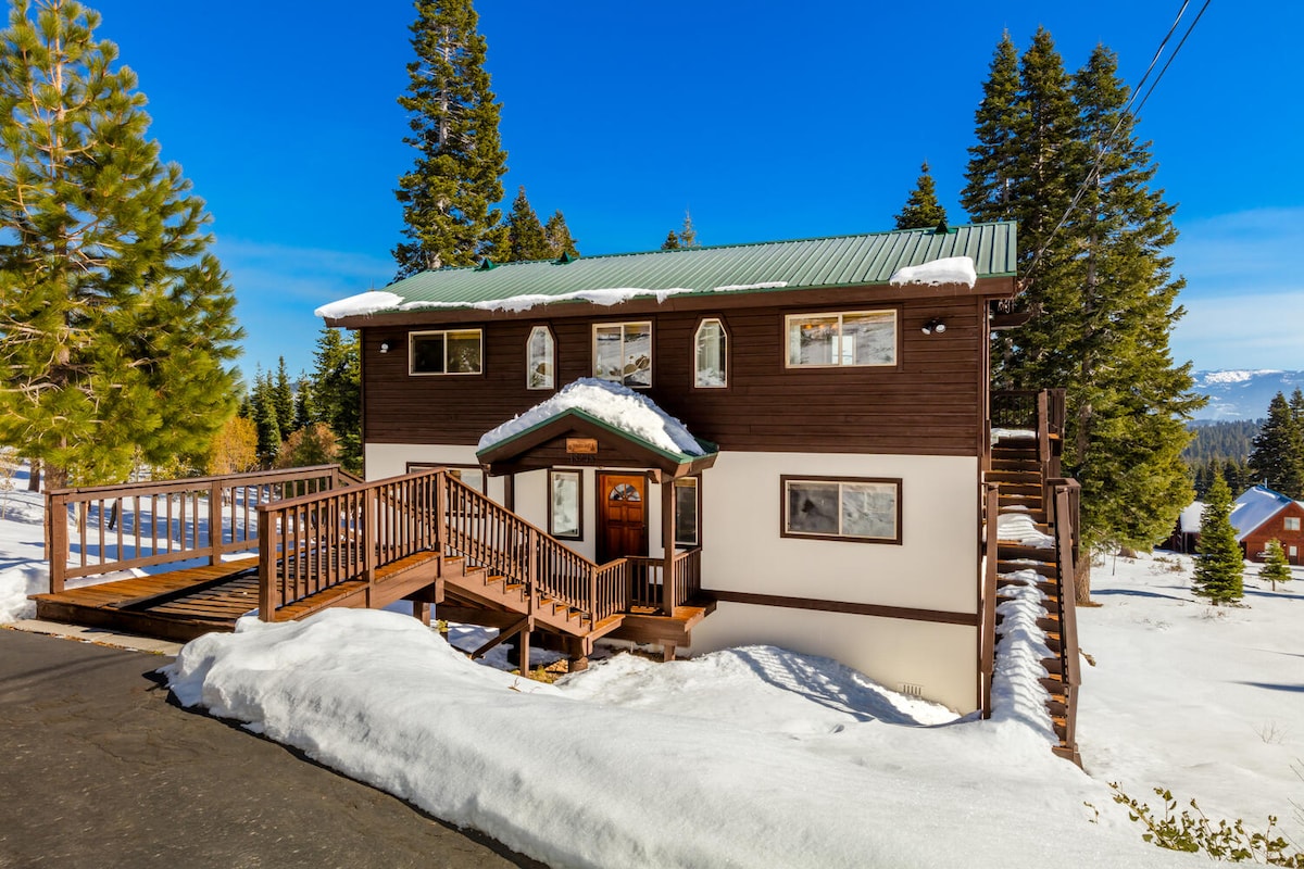 Disfruta de una hermosa casa en Tahoe Donner con excelentes vistas a Northstar y al monte Rose. Jacuzzi nuevo, chimenea, aire acondicionado central. Disfruta de un acre de montaña de primera, con dos cubiertas elevadas. Fácil acceso a los servicios de Tahoe Donner, a las estaciones de esquí del lago norte y a las zonas de recreo de la región. La casa tiene un escritorio Uplift para sentarse/estar de pie, un monitor Dell de 32 pulgadas e Internet de alta velocidad para que puedas trabajar cómodamente. En el dormitorio inferior hay una nueva mesa de futbolín Tornado. *** Debes tener al menos 25 años para reservar.