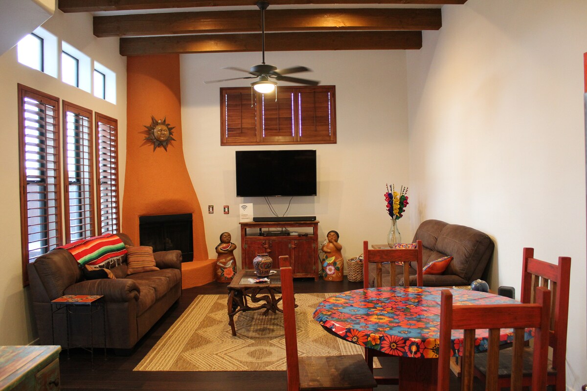 Relax in our pet-friendly townhome. It's bright and comfortable with a private walled patio, grill, sky deck and onsite parking. Excellent amenities, with hotel-grade linens and towels. Community salt water pool and hot tub (both heated year round). Indoor gas fireplace. Free wi-fi and a desk nook for remote work. Quiet, safe neighborhood. Walk to the DeAnza trail and the #1 Small Art Town in America. Easy drive to Tubac Golf Resort! Perfect for exploring Tubac. AZ TPT compliant