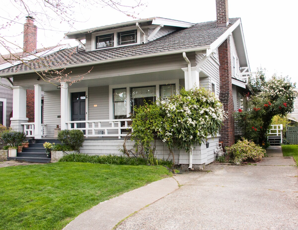 ¿Visitas Seattle? ¿Necesitas una cocina totalmente equipada cerca de una tienda de comestibles? ¿Te importa la estética? Esta casa es para ti. Elige la lujosa cama tamaño queen bajo una lámpara de araña moteada (pared con detalles amarillos) o una cama de tamaño completo más firme rodeada de libros y artesanías (pared con detalles rojos). Relájate en la sala de estar y disfruta más del diseño ecléctico. Disfruta de tus contenidos favoritos en el proyector conectado a Apple TV. Cena en el patio delantero. Aparcamiento en el sitio, cargador de vehículos eléctricos disponible - compensación solar.