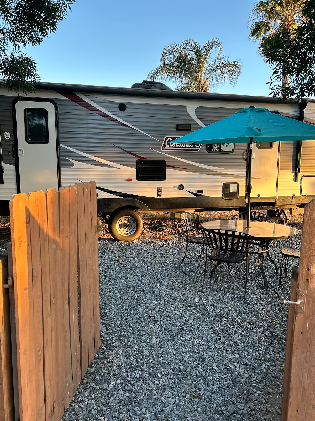 Beautiful 5th wheel with private deck in charming town of Exeter. Located in the country amongst citrus orchards, only 2 blocks outside city limits. Close to restaurants, shops, and beautiful downtown Exeter. Fenced yard area for parking (and pet friendly!). Prime location for visits to Sequoia National Park, Three Rivers, Lake Kaweah and more, with easy access to Hwy 198 and Hwy 65. Sleeps 2 in bedroom and has pull out sofa in living room for kids or another adult. Full size water heater added