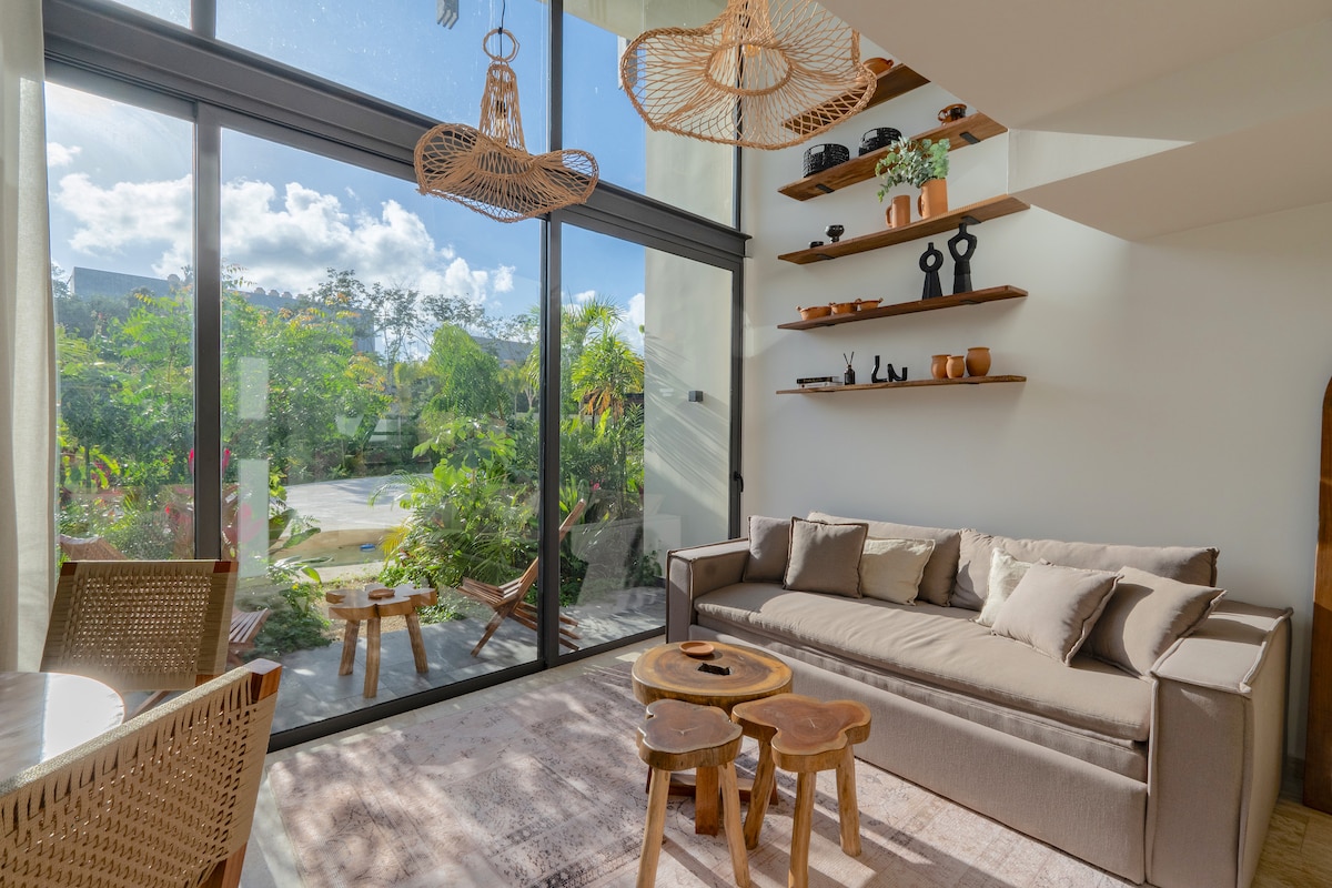 Welcome to a stunning designer loft set in the heart of Tulum’s jungle, where modern architecture meets natural beauty. This two-level open-concept loft is thoughtfully designed with clean white tones, warm wood finishes, and carefully curated décor, creating a space that feels both elegant and inviting. Floor-to-ceiling windows fill the loft with natural light during the day, while at night the soft interior lighting and lush jungle surroundings create a serene and intimate atmosphere.