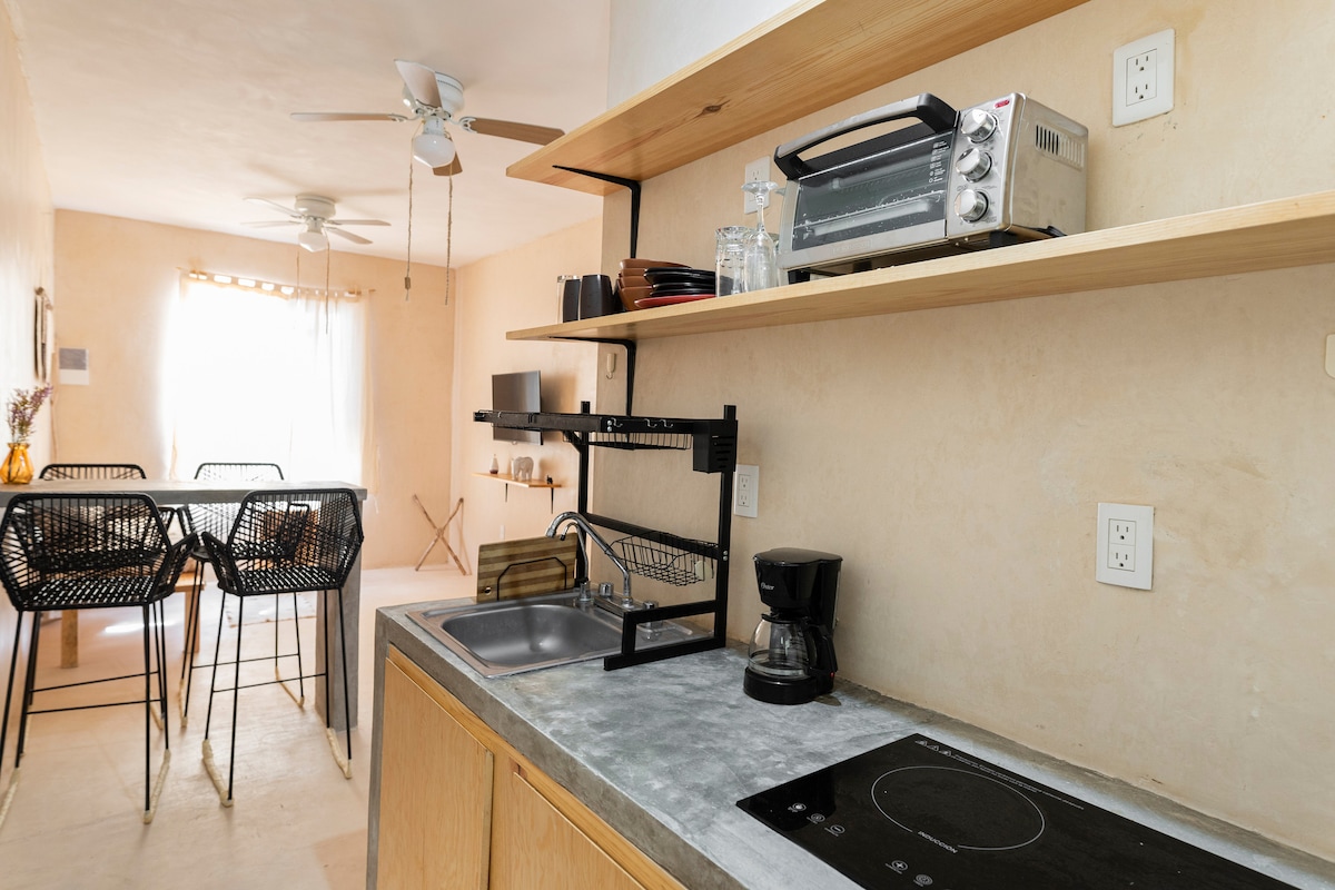 Disfruta de la sencillez de este alojamiento tranquilo y céntrico, a 3 cuadras de la estación de autobuses, a metros de la unidad deportiva de Tulum, en un área segura, restaurantes, cafeterías y lugares para hacer compras cerca. Acomoda a dos personas en una cama queen size y un sofá cama. Baño privado, aire acondicionado además de una cocineta. Wifi con 184 mbps.