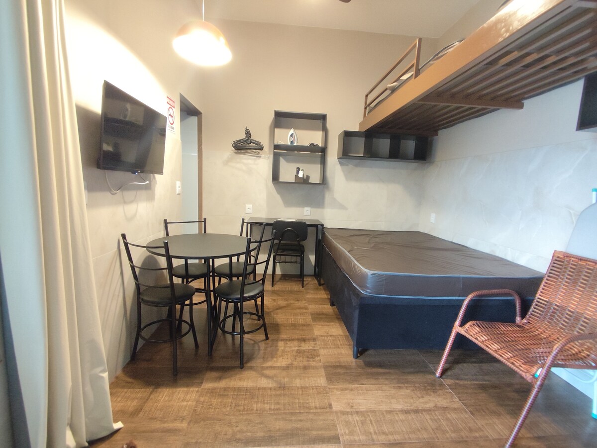 Apartamento Loft no térreo com mobília para aluguel ou temporada , ( Suíte conjugada ) com Ar Condicionado Split , Frigobar , Pratos , Talheres , Copos , Fogão de indução duas bocas sem forno, Forno elétrico, Ferro de passar roupas , Mesa , Bancos , Poltronas , Microondas , Escrivaninha trabalho , Cama Casal , Cama Solteiro Dupla Suspensa , Travesseiros , Smart Tv Wifi You Tube e com canais abertos , Ventilador de Teto , Wi-fi . *ATENÇÃO NÃO FORNECEMOS ROUPA DE CAMA E BANHO.