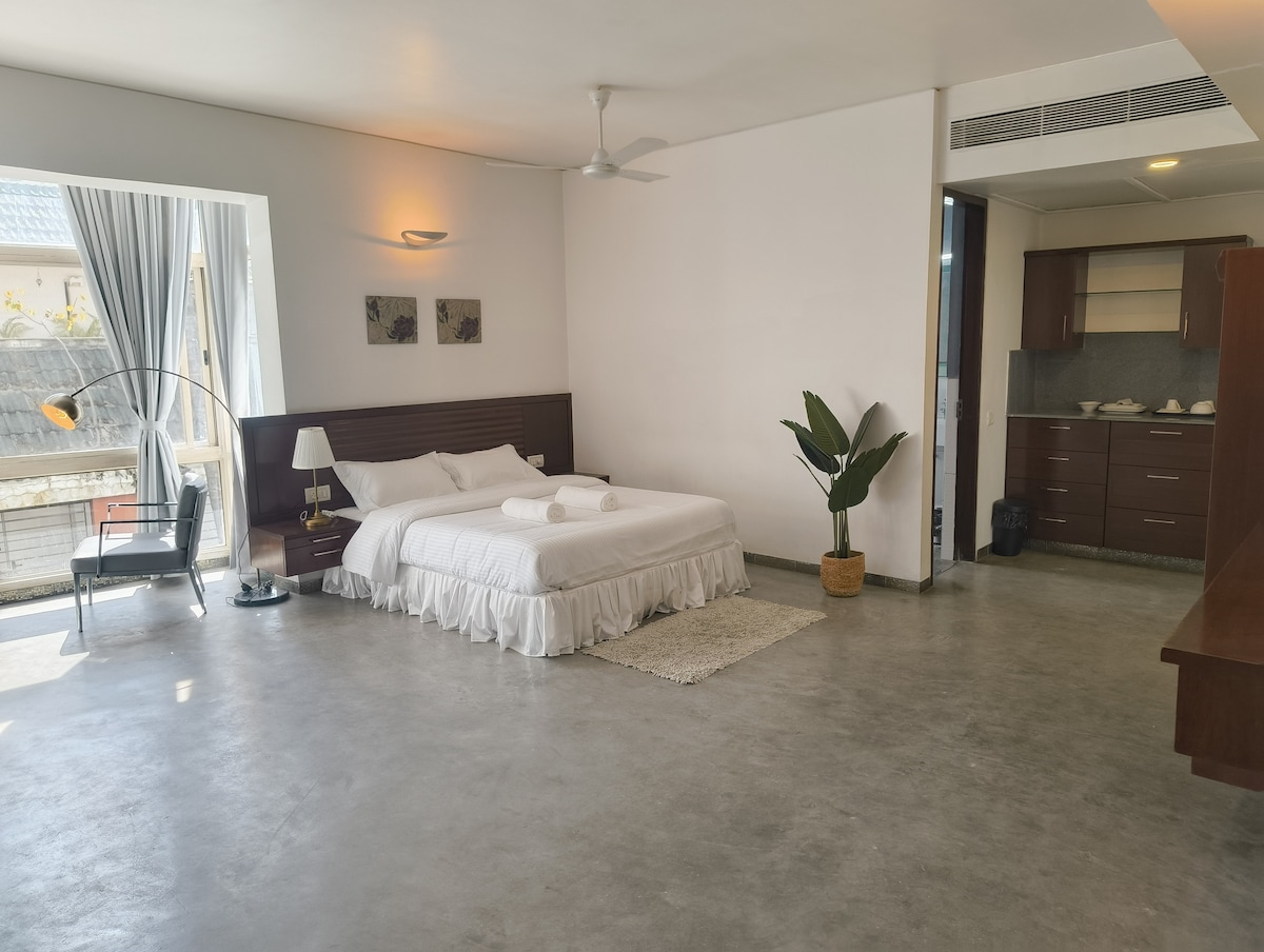 Un apartamento estudio en la azotea con vistas al parque Cubbon y al estadio Chinnaswamy (donde juega RCB). Este alojamiento es perfecto para parejas y profesionales que quieren estar cerca del centro de Bangalore. El dormitorio y la sala de estar están en un espacio continuo, con grandes ventanales que te dan mucha luz natural, así como una gran vista llena de verde. Hay una pequeña cocina pequeña para recalentar y almacenar alimentos, y un baño espacioso. ¡Esperamos que disfrutes de este espacio único tanto como nosotros!