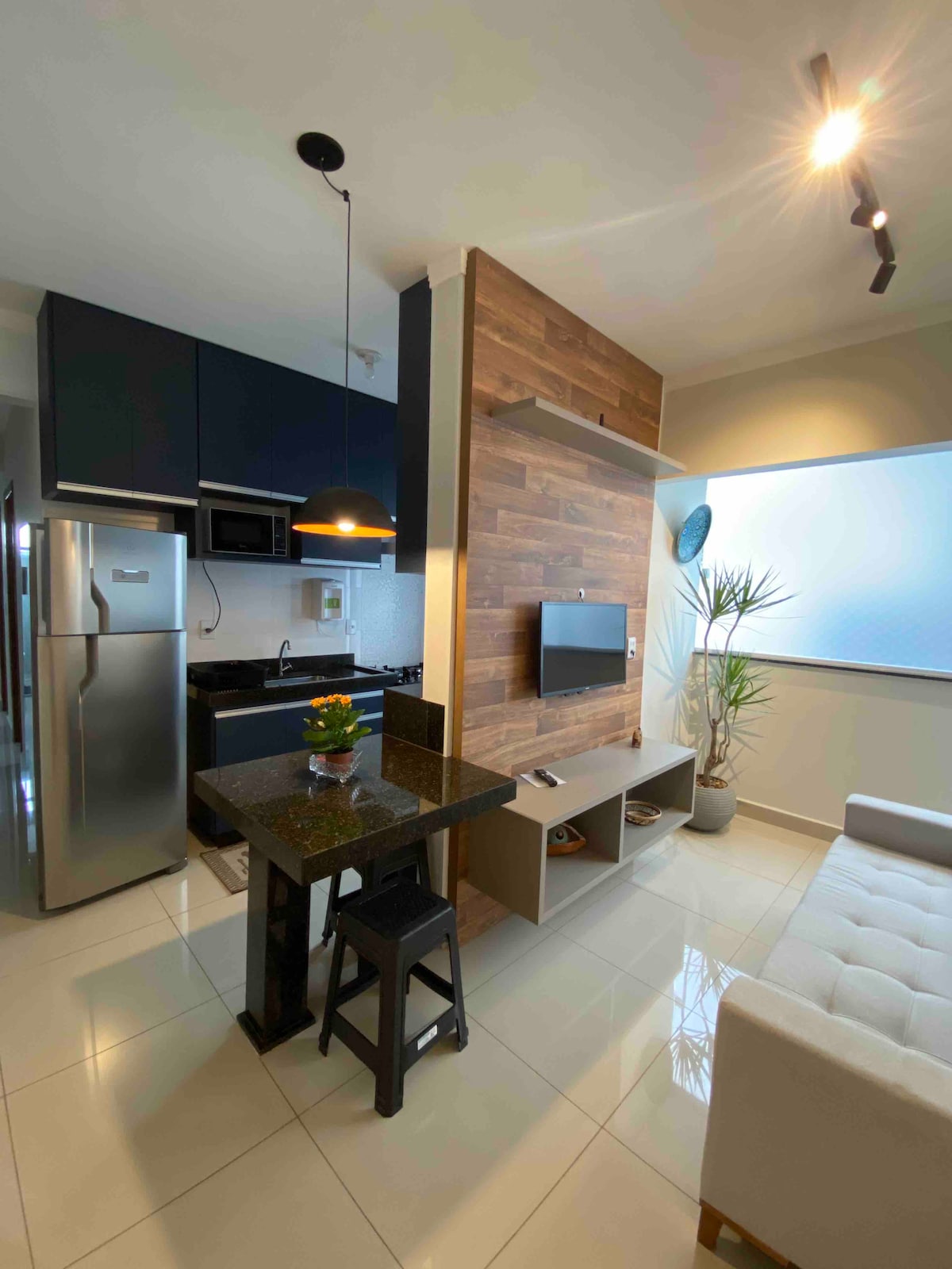 Apartamento de 1 dormitorio en el corazón de Uberlândia. Situado en el barrio de Saraiva, cerca de la Universiade (UFU). Este lugar especial está cerca de todo y es ideal para planificar su visita, excelente ubicación para quienes vienen por trabajo o placer. Increíble alojamiento en un espacio estratégico, bien decorado, exclusivo para los huéspedes, con toda la practicidad y comodidad del «hogar». Proporcionamos ropa de cama y toallas. Apartamento de 1 dormitorio, planta baja, garaje cubierto, cerca de la universidad, bares, restaurantes, supermercados, etc.