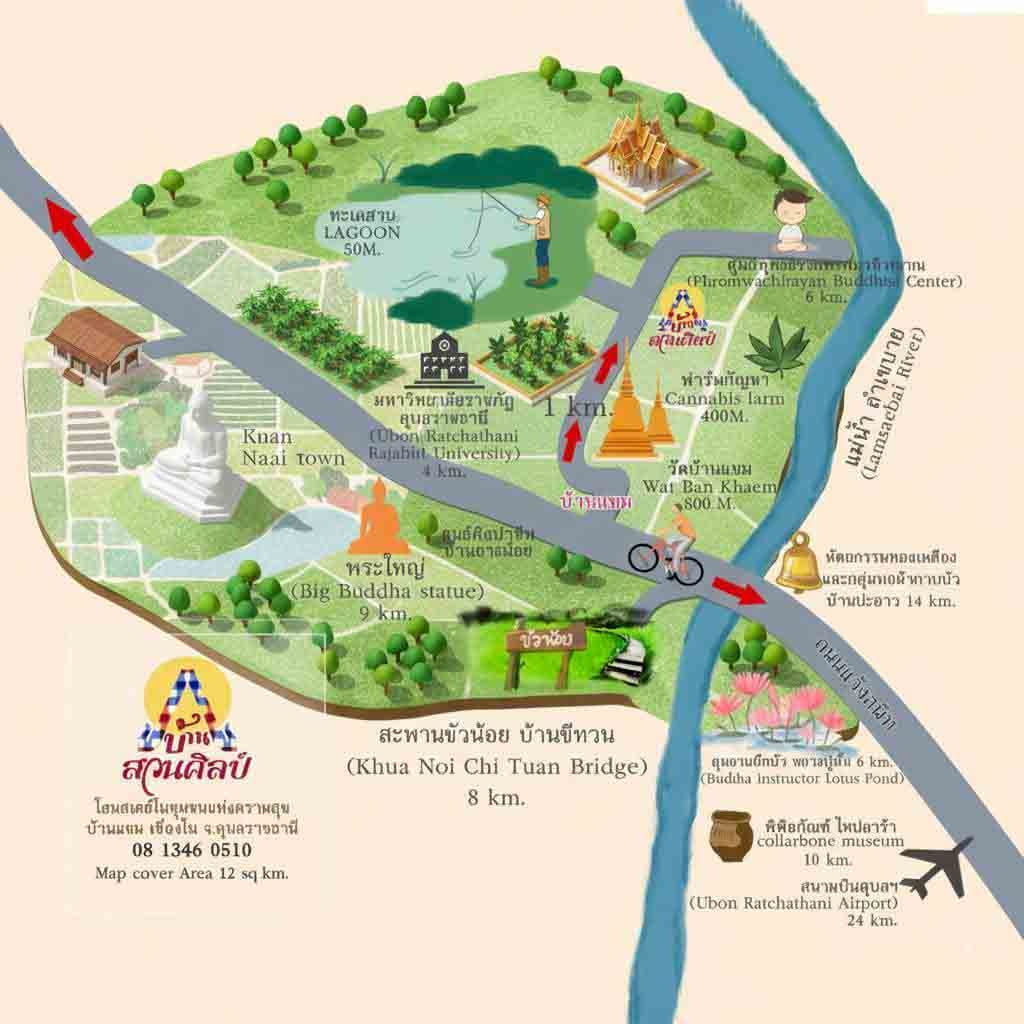 Ubicación tranquila en la parte noreste de la ciudad. A solo 500 metros del 50 aniversario del Hospital Memorial Maha Vajiralongkorn. Estacionamiento privado. Una excelente ubicación para visitantes del hospital, trabajadores y turistas. Hay tres casas idénticas en esta ubicación, a 240 metros de la carretera principal y lejos del tráfico. A poca distancia a pie de los mercados de comida del pueblo, cafeterías y lavanderías. La sala de estar es de aproximadamente 27 metros cuadrados (290 pies cuadrados). A 18 minutos (11 km) del aeropuerto de Ubon.