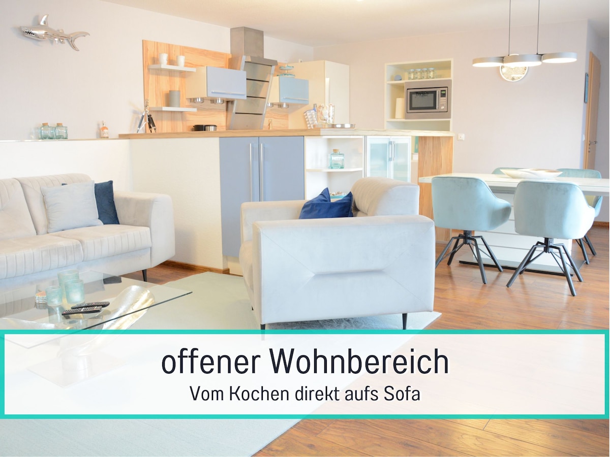 Perfekt für Pärchen oder kleine Familien im Ostseeurlaub! Diese Ferienwohnung bietet mit einem Schlafzimmer und einer gemütlichen Schlafcouch Platz für bis zu 3 Personen (inkl. Baby /Kind). Der große Wohn- und Kochbereich lässt keine Wünsche offen: voll ausgestattete Küche mit Backofen, Cerankochfeld, Geschirrspüler und Kühl-Gefrierkombination; großer Esstisch; moderner TV; Kamin und großer Terrasse. Im großen Bad können Sie sich mit einer Badewanne, Dusche und Sauna verwöhnen.