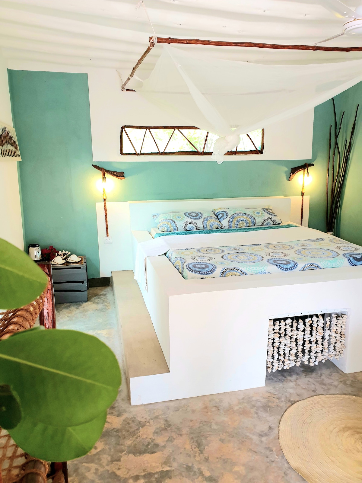 ¡Habitación con vistas al mar y balcón privado! 1 cama doble, 1 cama individual y baño privado con ducha en el 2. ° piso. Completamente renovado en diciembre de 2024. Despiértate en la costa noroeste de Zanzíbar con las olas del océano, los sonidos de la naturaleza y una taza de café caliente. De océano a boca comiendo con calamares frescos, pescado y cangrejo, kayak a una isla, ver atardeceres, amaneceres, con noches de hoguera. Días de hamaca perezosos, wifi y vida rústica de lujo, comidas suahili de 6 estrellas, senderismo local, kayak.