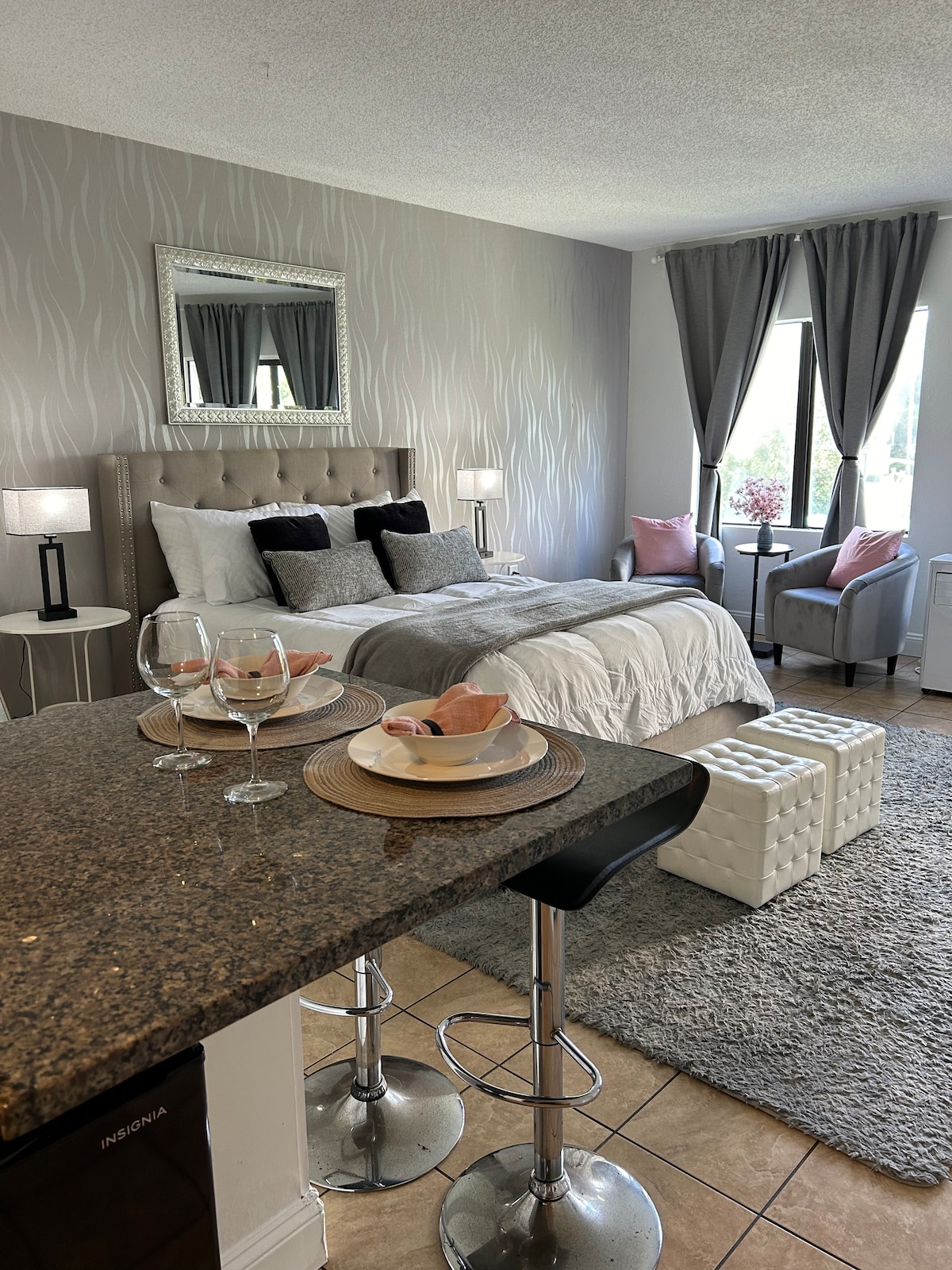 El moderno condominio recientemente renovado se encuentra dentro de StaySky Suites junto a International Drive, a solo 3 millas del nuevo Epic Universe, a 2,5 millas de Universal Studios y a 2 millas del Centro de Convenciones del Condado de Orange. El exterior/interior del hotel está un poco anticuado, sin embargo, entra en nuestra unidad para descubrir un espacio completamente actualizado y elegante diseñado para el confort y la relajación. Camina a restaurantes, bares y tiendas, o relájate en tu tranquilo refugio con café diario. Wifi y estacionamiento gratuitos.