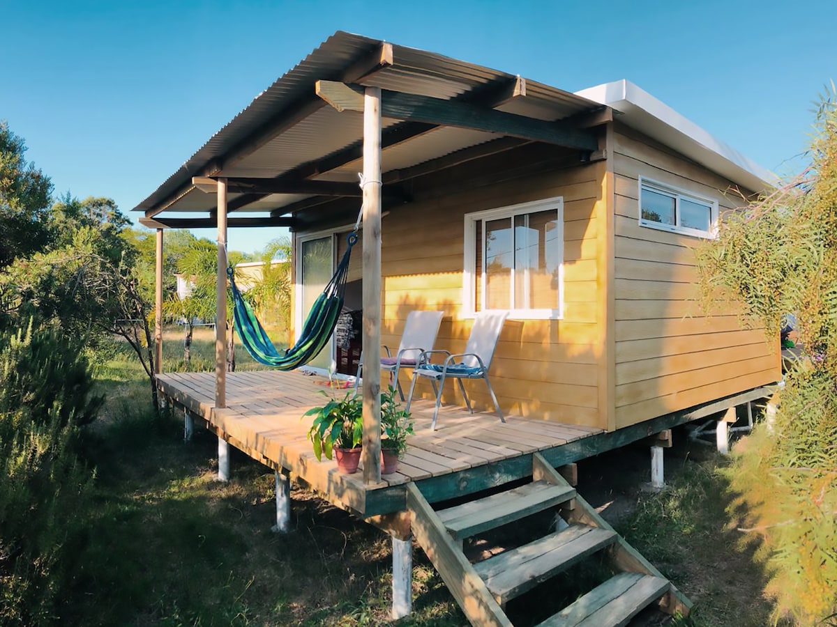 Casitas_del_ensueno: Cabaña a solo 50m. de la playa y rodeada de bosque nativo. En plena naturaleza, está construida con materiales cálidos y de diseño, aberturas doble vidrio, estufa a leña. Amplio espacio abierto con vista al bosque, living-cocina con todo para 4 huéspedes (max. 3 adultos), 1 dormitorio en suite con salida al deck, 2do dormitorio con cama nido (twin) y 2do baño. Wifi por FibraOptica. Pura luz y bosque a un paso del río. Estacionamiento, parrillero, TV, hamaca, sillas de playa.