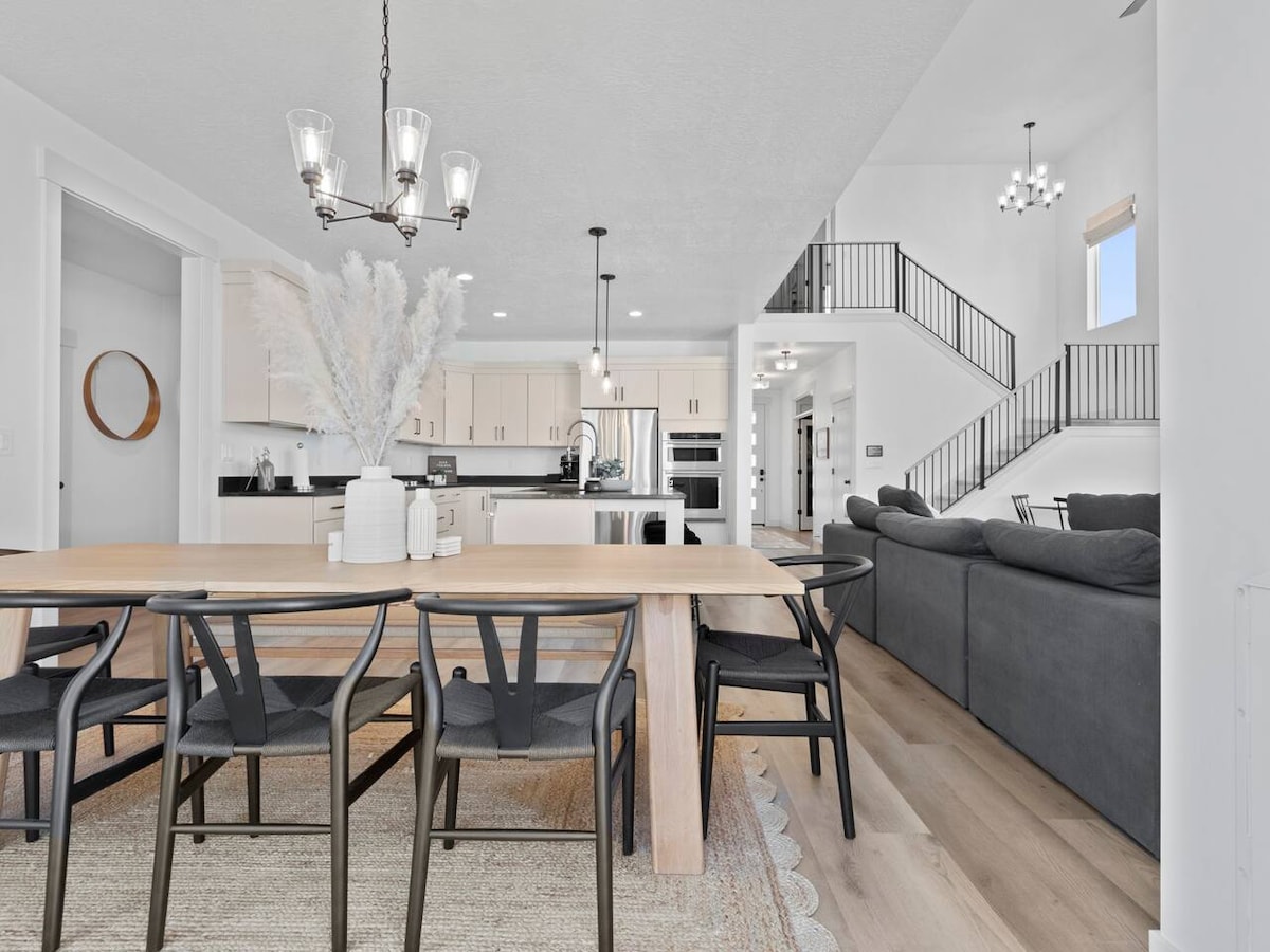 Esta nueva y espaciosa construcción es a la vez lujosa y acogedora. Con impresionantes techos abovedados, hermosos acabados, luz natural interminable y detalles cuidados, sentirás el amor que se puso en el diseño y la decoración. Esta casa ofrece 4 dormitorios y 2,5 baños y es un excelente lugar para una escapada relajante. Ubicación céntrica: ¡a 2 millas de la I-15, a 3 millas de Target, In-N-Out, Cinemark, Waffle Love, Olive Garden, Texas Roadhouse y más! A 15 minutos de Silicon Slopes. - American Fork -