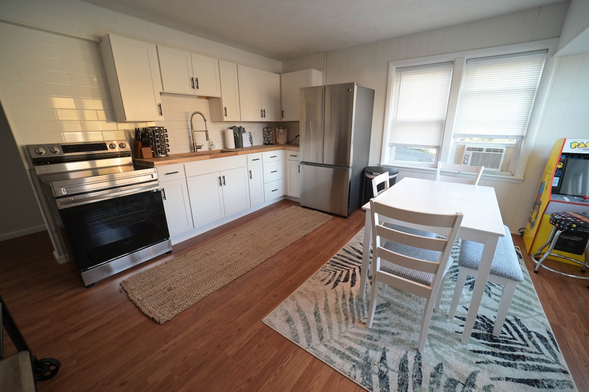 “The Double Decker" is Condo 2, a 4-bedroom unit within the Oneida Lake House, a renovated lakefront property with a total of five condos. This is the second-largest of the five units, with a full kitchen, a living room with a 65" smart TV, and arcade games for extra fun. Step out to the shared lawn, firepit, hot tubs, and beach just a few steps away. Grill, sip a drink under the gazebo, or gather around the fire as the sun sets over the lake.
