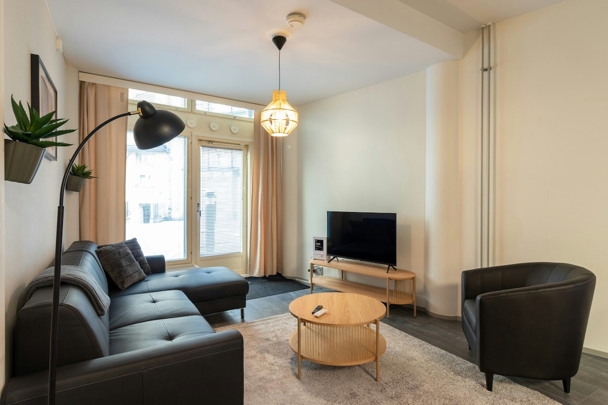 Encantador estudio de 32 m² en Kruununhaka, Helsinki, ideal para dos personas. Cuenta con dos camas individuales, una cocina completa, una acogedora sala de estar y un moderno baño. Se admiten mascotas, con lavandería compartida, entrada con código y todos los elementos básicos incluidos. Una base elegante y céntrica para explorar la ciudad.