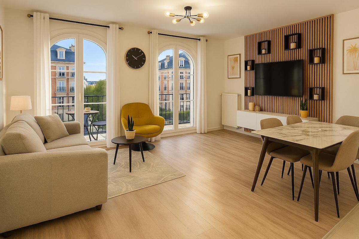 ✨ Bienvenue dans votre appartement haut standing, au sein d’une résidence neuve, calme et sécurisée. Profitez d’un séjour confortable, en famille, entre amis ou en couple. À 5 min en voiture de Disneyland Paris, 10 min à pied de Val d’Europe et 30 min de Paris via le RER A. Literie 5★, terrasse privée et parking inclus : le confort d’un hôtel, la liberté d’un logement entier. Elegant flat by an English architect, 5 min from Disneyland Paris. 5★ comfort, private terrace & parking included.