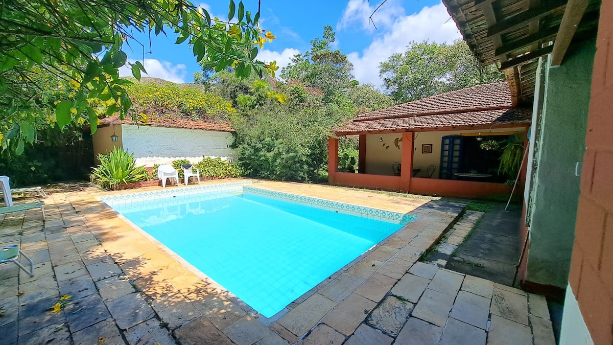 Casa de campo com 200 mt2 de área construída, toda rodeada por uma linda varanda colonial, sala ampla com cozinha americana, 4 quartos, sendo 2 quartos suites e os outros 2 demi suite, um dos quartos possui ar condicionado, casa possui internet Wi-Fi fibra ótica, casa super arejada, grande área gramada com várias árvores frutíferas, piscina, churrasqueira, Grande área gramada. Local muito calmo, pouco movimento. Excelente para se desconectar, apreciar a natureza e o canto dos pássaros
