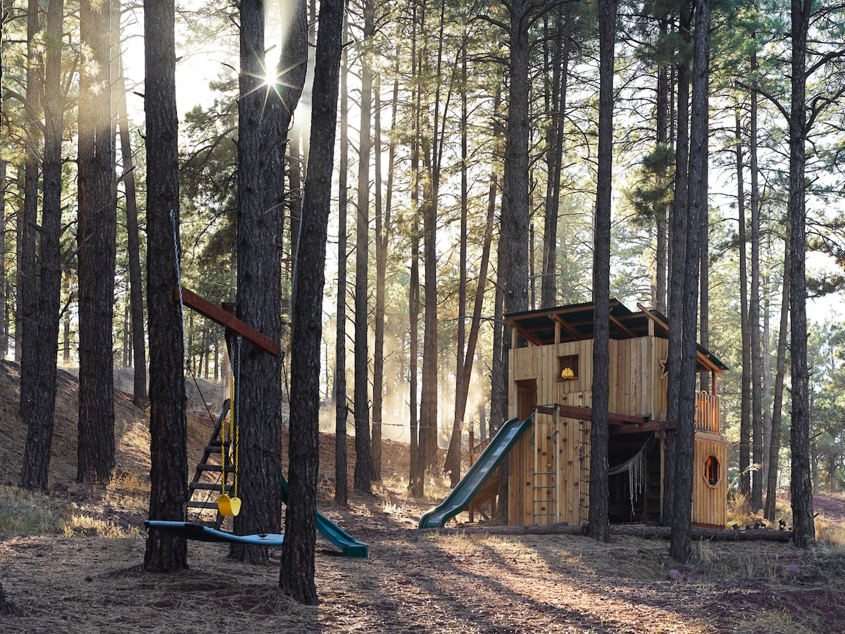 Aunque técnicamente no es una casa del árbol, esta cabaña de troncos está a 79 pasos de altura, se encuentra por encima del nivel del suelo y está rodeada de pinos ponderosa. Una vez dentro de esta acogedora y tranquila casa, te sentirás como si estuvieras en tu propia casa del árbol privada. Ubicado en Kachina Village, a solo 8 millas al sur del centro de Flagstaff, podrás disfrutar de cielos oscuros y noches tranquilas mientras estás cerca de todas las atracciones de Flagstaff. Tenga en cuenta que tiene que subir los 79 escalones y cruzar un puente peatonal sobre Pumphouse Wash.