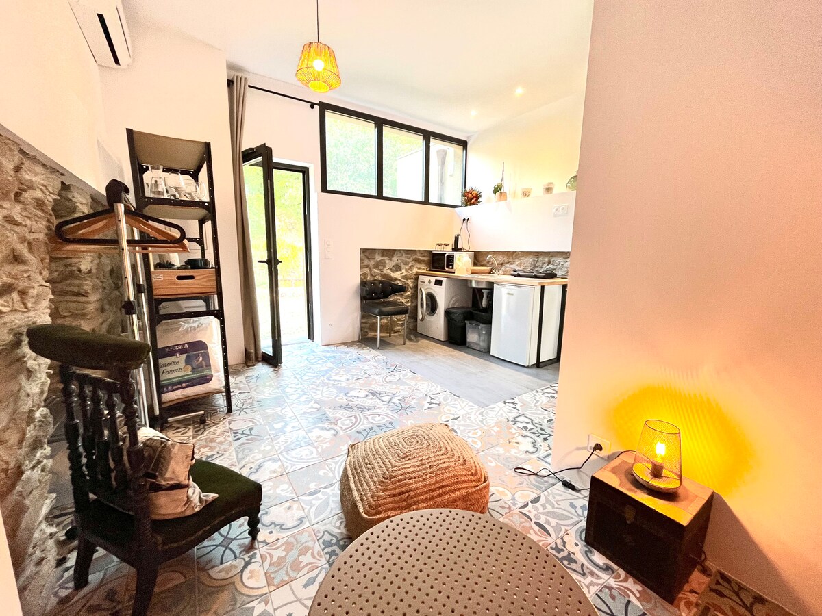 Déjese llevar por los sonidos de la naturaleza y venga a relajarse en este hermoso refugio de madera, atípico y confortable. Una intimidad preservada lejos de la multitud de turistas y cerca de la playa o la montaña, es la magia de Córcega. Un gran jardín de 800 m2 con salón solo para usted. Le acompañará el canto de los pájaros, tal vez le visite un gato curioso o un caballo acogedor. Para un turismo razonado, ¡aquí nunca tendrá aire acondicionado! :)))