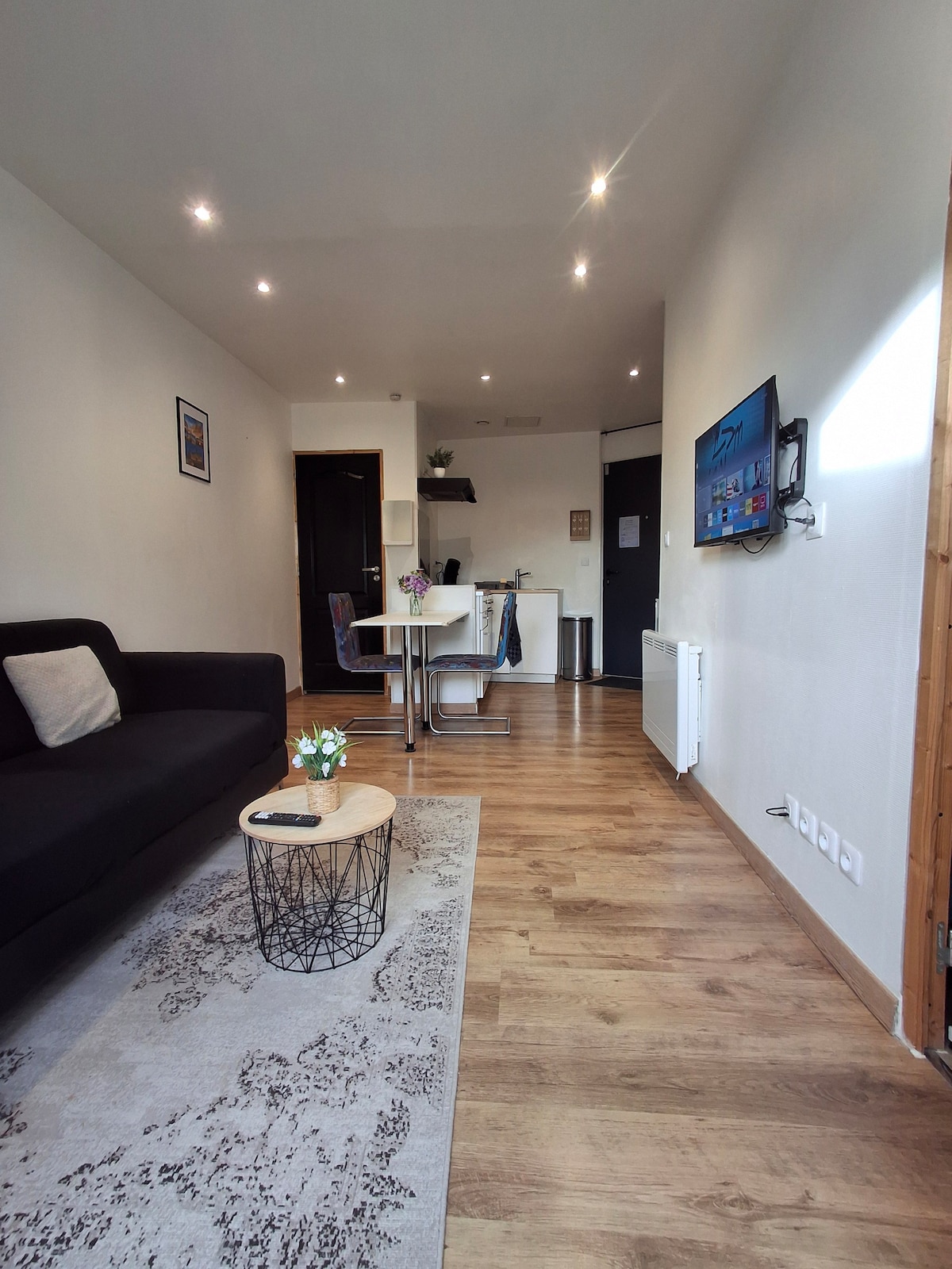 Appartement moderne et lumineux, parfait pour voyageurs et travailleurs en déplacement. Il offre une cuisine ouverte entièrement équipée, un salon confortable avec coin repas, ainsi qu'une chambre séparée pour plus d'intimité. La salle de bain dispose d'une douche à l'italienne pour un confort optimal. Situé dans un quartier calme, à proximité des commerces, cet appartement propose un cadre agréable pour un séjour pratique et reposant, que ce soit pour le travail ou les loisirs.