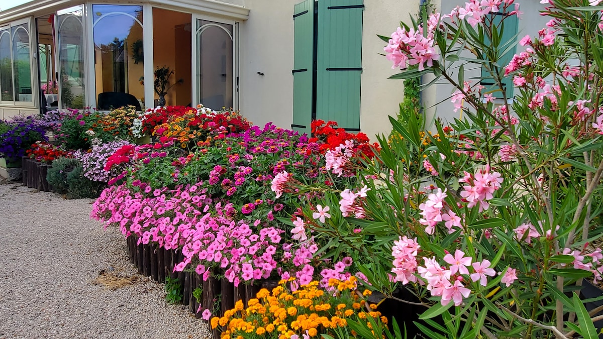 Bienvenido a casa de Marie José y Alain. Vivimos en pleno campo, entre Blois (a 20 minutos), Vendôme y Beaugency. Ofrecemos nuestra habitación «Coquelicot» de 22 m2, completamente independiente, con baño contiguo, y una sala de estar con cocina americana de 38 m2. Nuestra granja presenta un entorno muy florido, donde encontrará la tranquilidad en plena naturaleza, cerca de los castillos del Loira, jardines, bodegas. Venga a descubrir nuestros cientos de flores y rosales. Desayuno incluido en el precio.