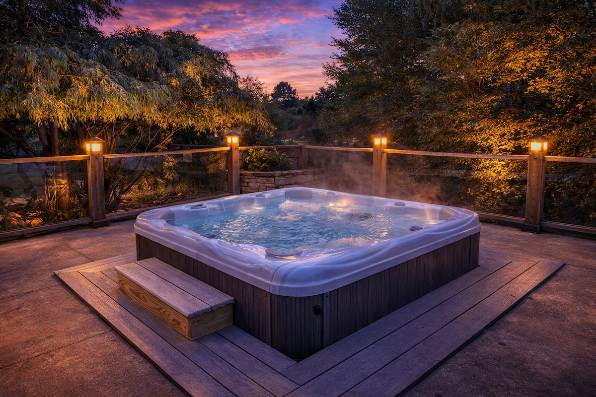 ¡Hermoso oasis de jardín con JACUZZI y porche cubierto!