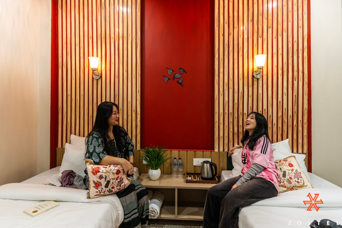 Relax in your private room that comes with 2 single beds, an AC, and an ensuite washroom. We've arrived in one of the world's oldest living cities with Zostel Varanasi (Dashashwamedh). 5 mins from Dashashwamedh Ghat, our hostel in Varanasi brings together a vibrant common room, a breezy rooftop area, and comfortable dorms & private rooms.