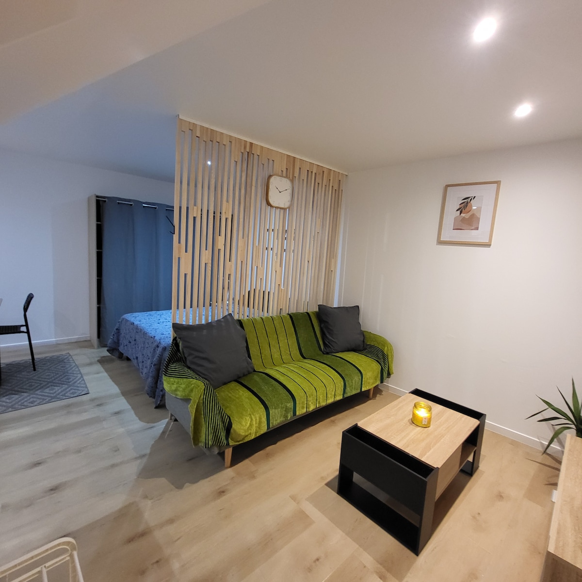 Studio créé dans sous-sol semi enterré fait de récup et d un canapé convertible neuf Calme grâce à son isolation malgré une voie ferrée proche. Étant famille d'accueil pour animaux abandonnés, nos amis 4 pattes sont forcément les bienvenus. Toutefois, nous préférons qu'ils ne restent pas seuls dans un environ inconnu pour éviter toutes dégradations. Nous avons investi beaucoup de temps et d'argent pour vous proposer un petit nid douillet.
