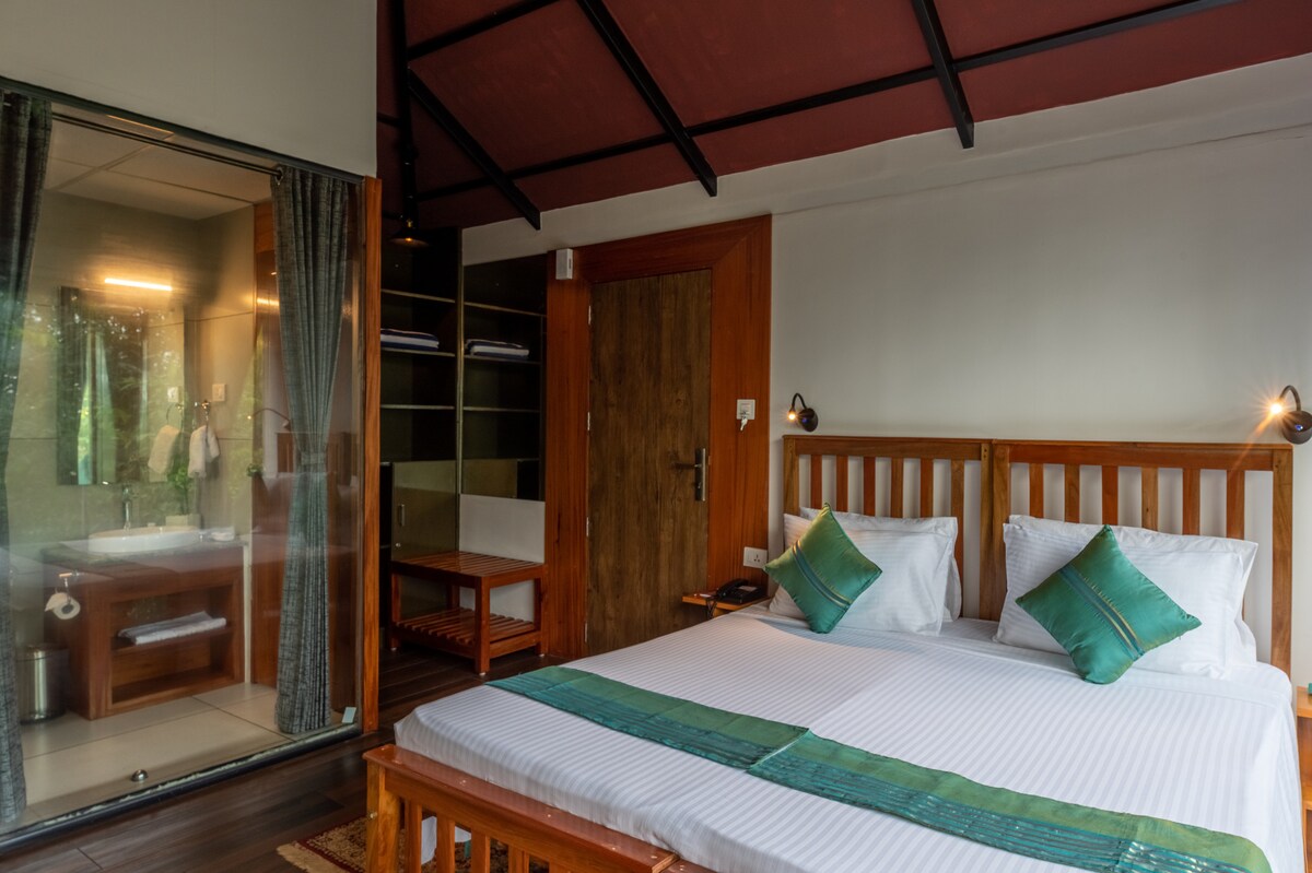 Una pintoresca casa de campo situada en Chadayamangalam que te transporta a una tierra de exuberantes bosques verdes y aire tan puro que no tienes ganas de volver. Disfruta de una cabaña tipo estudio con vistas panorámicas de la famosa estatua de Jatayu, con una variedad de emocionantes caminatas para despertar al aventurero que llevas dentro. Los muebles de madera realzan el viaje hacia el exuberante paisaje natural, mientras que la iluminación realza la calidez del suelo, creando una sensación de cariño. ¡Felices vacaciones!