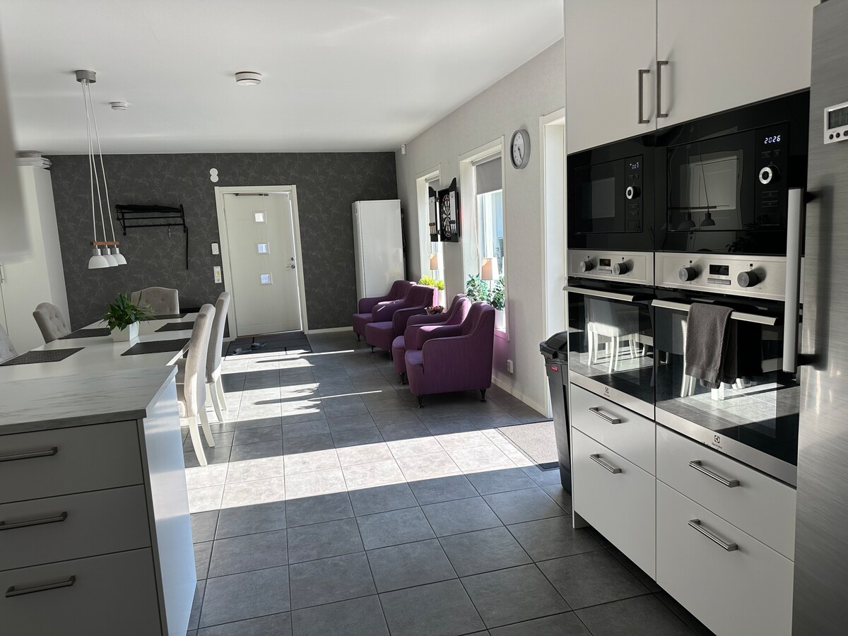 En helrenoverad villa (2022) med hög standard, fina och tysta rum. Passar företagare/familjer/kompisgäng , som uppskattar fint boende i en lugn o tyst omgivning. 10 minuter till city. Bra bussförbindelser. Golvvärme i hela huset och köket har dubbla vitvaror av allt. Fullutrustat kök o fullt möblerat. Hotellstandard på sänglinnen & handdukar. Kommer ni med flyg, buss eller tåg? Transfer kan ordnas. Stor stenlagd uteplats med gasolgrill & matgrupp/lounge , paviljong. We speak Swedish and English