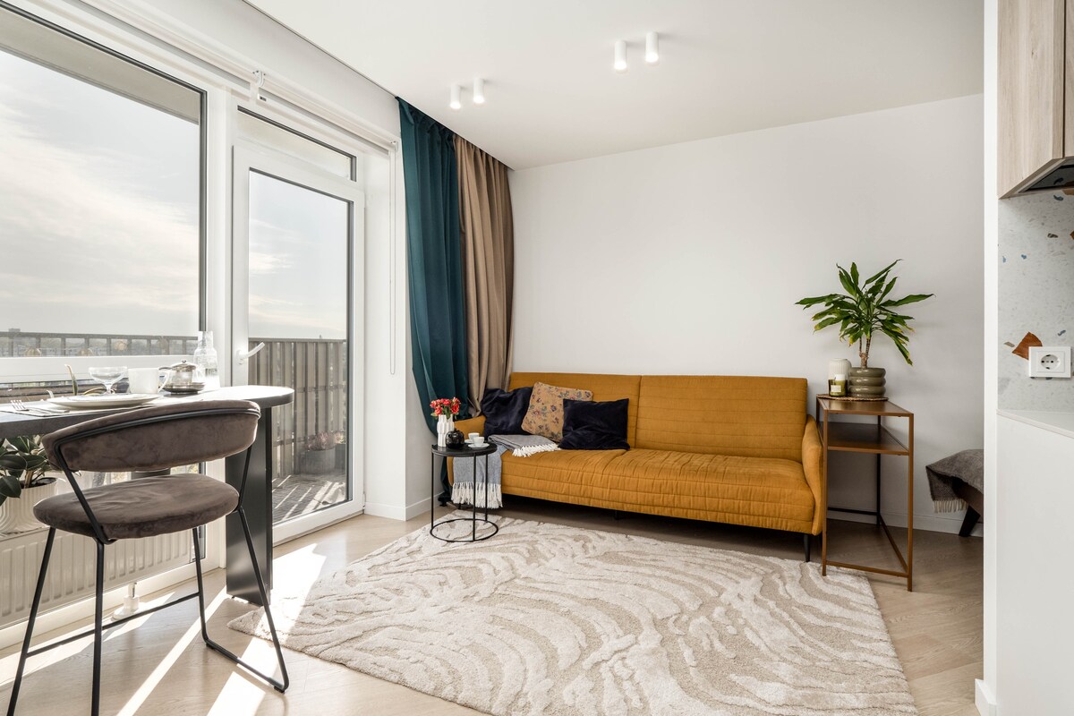 Modern design, On the top 24th floor of a famous skyscraper . Large windows offer amazing views of the city and beyond . The apartment has a lot of facilities,a big bathroom with a massaging jacuzzi, and a high quality home theater system with OLED tv and 12 speakers around. It’s located above a shopping mall, with the Old Town on one side and the new business district on the other, both within walking distance. Perfect for couples, business travelers, and families.
