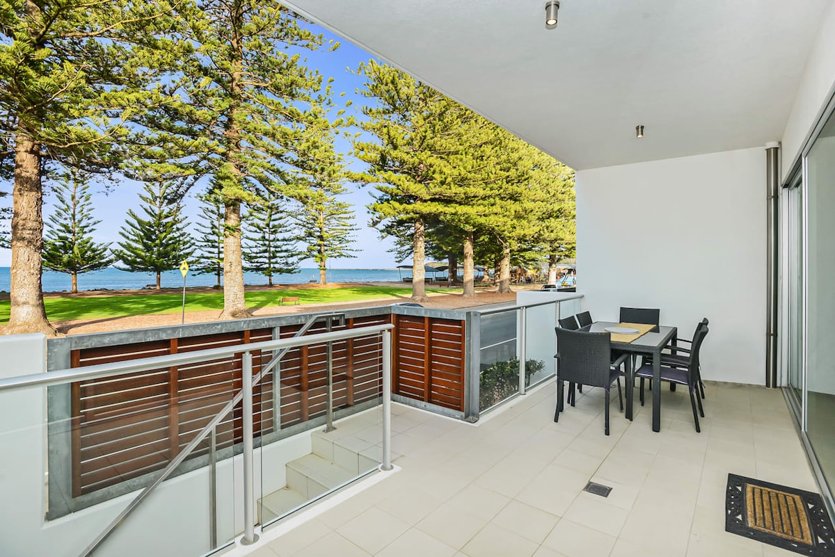 A beautiful, light bright and airy beach front apartment on the ground level. Imagine sitting on the private balcony, beverage in hand as you take in the sparkle of the sun dancing on an azure blue sea and the sound the waves make as they roll into the squalls of delight from children playing on the foreshore and the nearby playground. Sleeps 6 people with 3 beds.