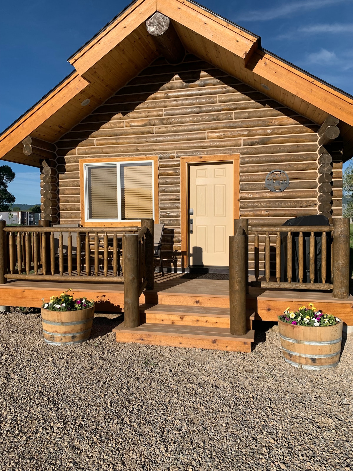 Disfruta de tu estancia en esta casa de 2100 pies cuadrados construida con cerchas a 2 millas del centro de Victor en 3 acres. La casa privada cuenta con una suite principal en la planta baja y una suite junior en la planta superior, ambas con camas tamaño queen. Ambas tienen su baño privado y ducha. Cómoda sala de estar conectada a la cocina. Cocina bien equipada para tu placer culinario y una barbacoa justo fuera de la puerta de la cocina disponible durante todo el año. Disfruta de hermosas puestas de sol desde la terraza de la sauna o relájate en la terraza trasera de la casa.