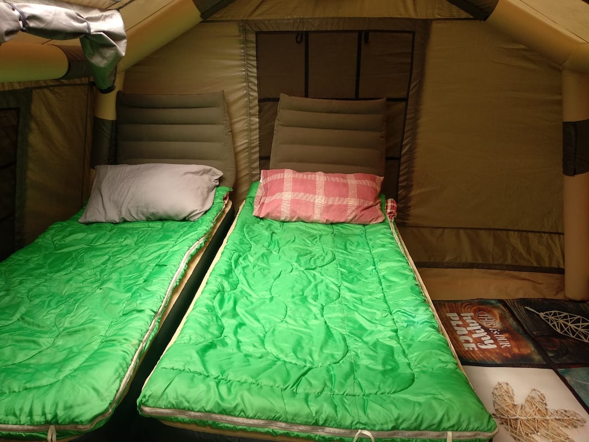 Carpa con 2 colchones inflables, almohadas y 2 cubre sacos grandes para dormir con tus propios sacos de dormir en su interior para noches que baje mucho la temperatura. Refrigerador, baño seco, ducha con agua caliente y cocina full equipada en espacios compartidos. Estacionamiento gratuito.