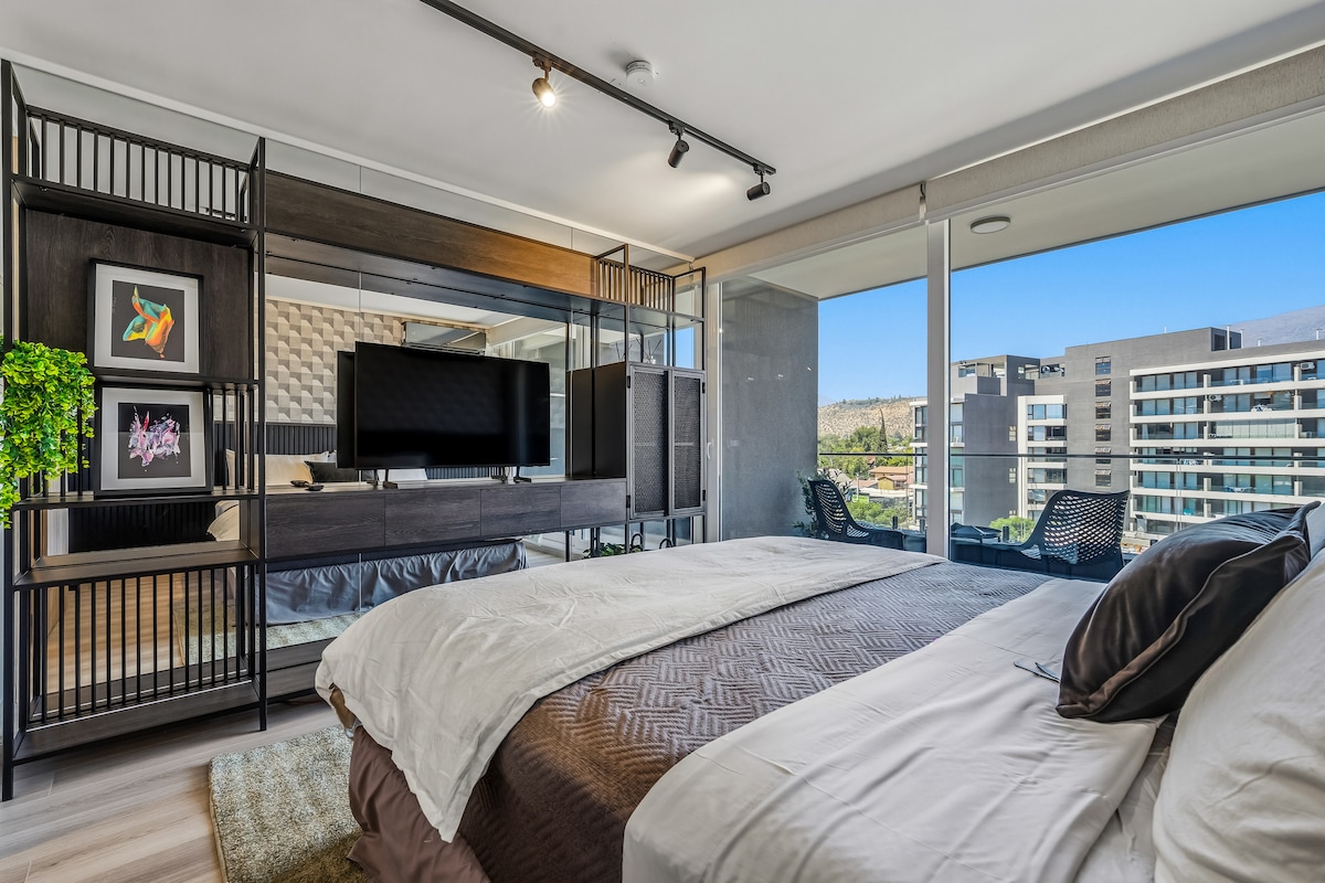 Estudio moderno, cómodo y elegante, Cama King iluminación ambiental, TV integrada y cortinas blackout. Ideal para descansar y desconectarse. Relájate en este espacio tranquilo y elegante. Aire acondicionado silencioso con purificador de aire. Cortinas roller blackout Excelente ubicación en Las Condes – Cerca de Mall Alto Las Condes, Parque Arauco, cafeterías, restaurantes y supermercados. Metro Hernando de Magallanes a 10 minutos caminando Ideal para trabajo, compras o turismo.
