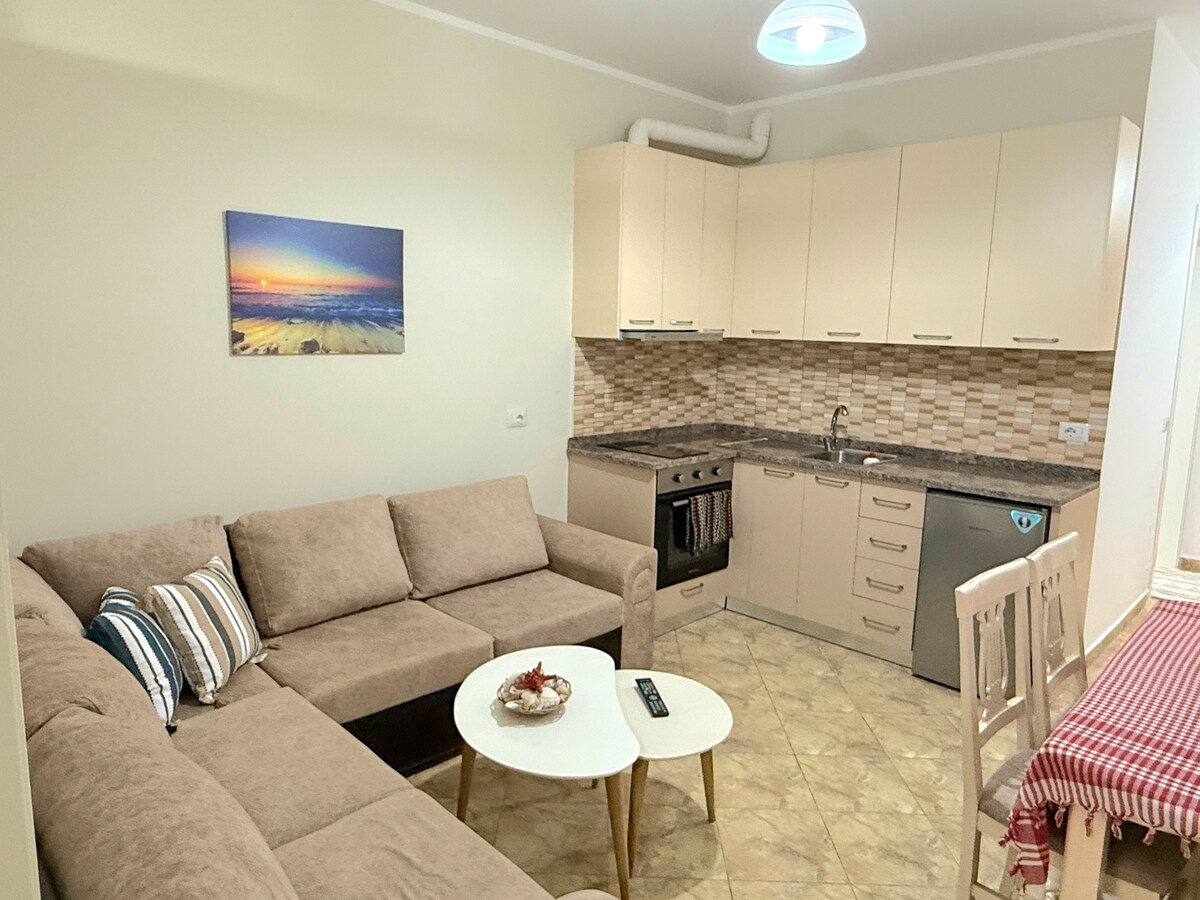 Hermosa construcción nueva, a 2 minutos del mar, con vistas a una carretera secundaria para que estés lejos del ruido del tráfico y la contaminación. ¡Puedes disfrutar del desayuno al sol en el balcón! Hay una sala de estar, cocina totalmente equipada, dormitorio con cama tamaño king (+ una cama plegable), escritorio y wifi rápido. Hay bares, restaurantes y supermercados literalmente junto al edificio. Puedes dar agradables paseos largos por la orilla del mar o recorrer toda la ciudad en bicicleta. A 50 minutos en coche de Dhermi. Buena conexión de autobús a Tirana y Saranda.