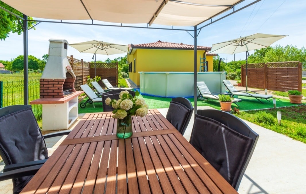Relájate y disfruta de los tranquilos alrededores mientras te refrescas del calor del verano en la piscina. Los huéspedes tienen acceso a una parrilla de leña junto a la cocina de verano, para que puedan disfrutar sin preocupaciones de todo el día al aire libre. Hay una ducha exterior y un aseo junto a la piscina. Por la mañana y al atardecer, los huéspedes pueden relajarse en la amplia terraza con una maravillosa vista de la montaña Učka y disfrutar de los amaneceres y puestas de sol. Los niños disfrutarán especialmente del parque infantil.